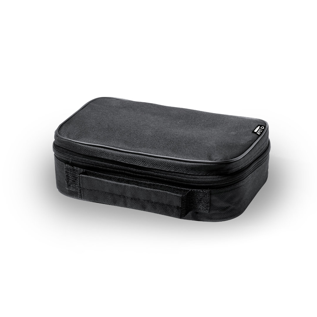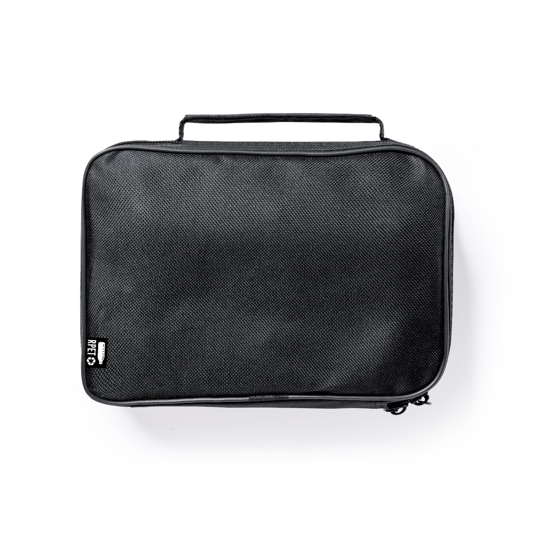 Juego de petanca de alta calidad. Incluye 6 bolas metálicas, boliche en madera y cuerda de medición. Set en resistente funda de RPET negra con asa de transporte y cierre de cremallera a juego. Distintitivo RPET en etiqueta exterior.El material RPET se elabora a partir de plástico reciclado, para así fomentar la reutilización de residuos plásticos y ayudar a la sostenibilidad del planeta.   8 Piezas. Funda Poliéster RPET   Metal