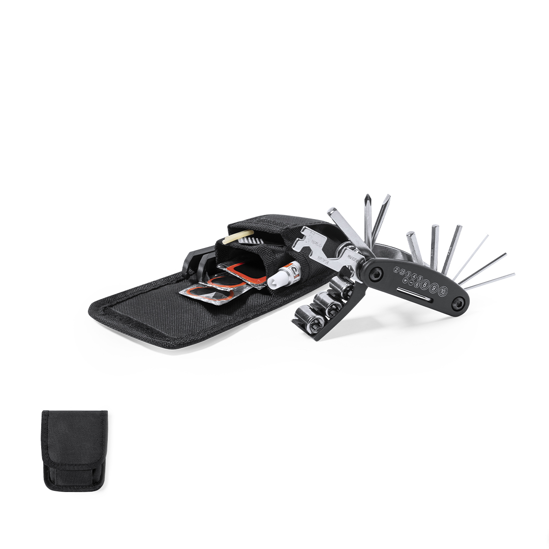 Completo kit de reparación para bici de 14 accesorios. Presentado en resistente estuche de poliéster 600D, con cierre de velcro. Incluye desmontadores de cubierta, multiherramienta y kit de reparación de pinchazos. 15 Accesorios Poliéster 600D