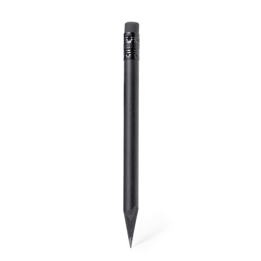 Lápiz de madera natural en acabado negro mate, con mina negra, punta afilada y goma en la parte superior a juego. Madera