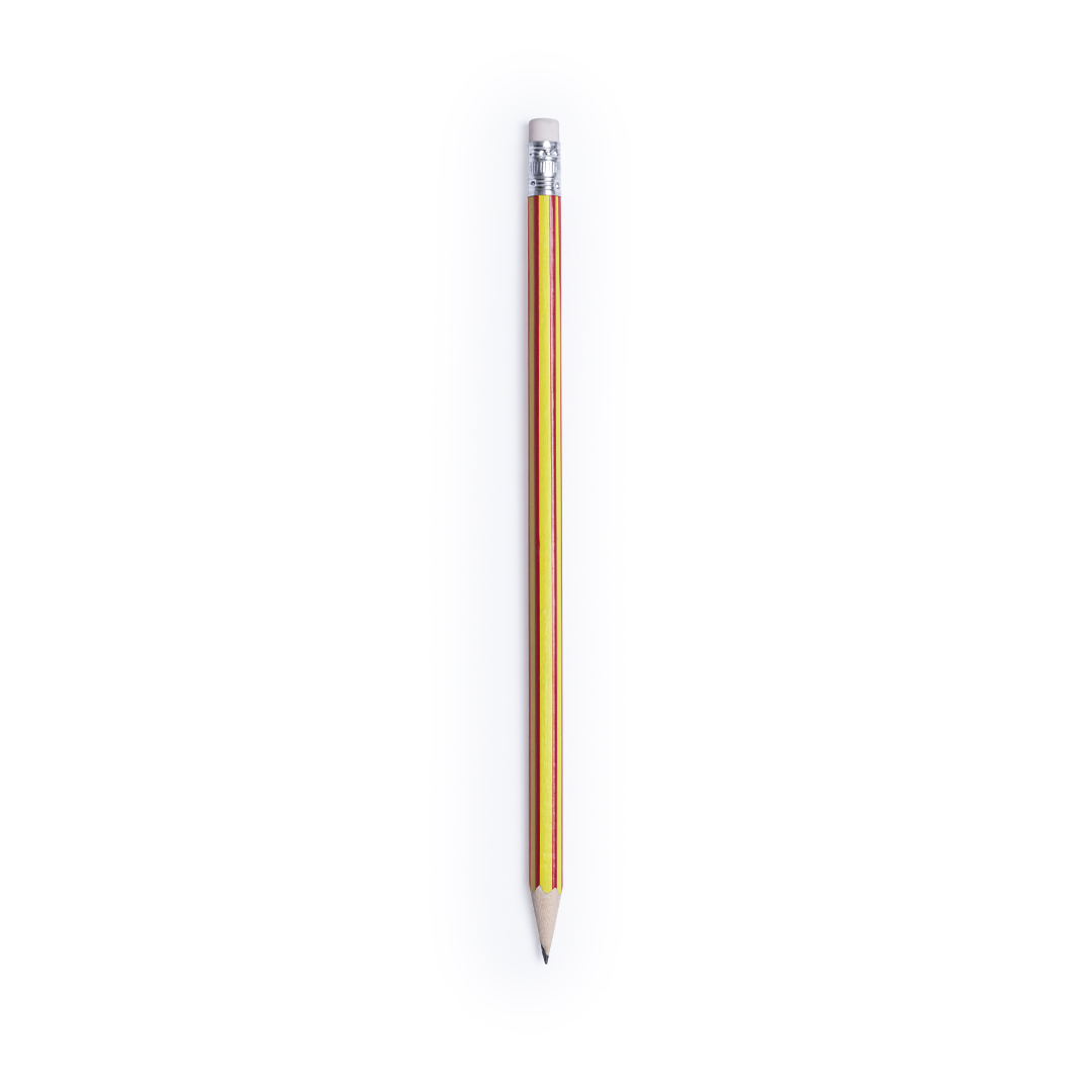 Lápiz de madera de acabado brillo. Cuerpo hexagonal y diseño bicolor, con goma de borrar en color blanco. Disponible en variada gama de colores, con mina negra y punta afilada. Madera