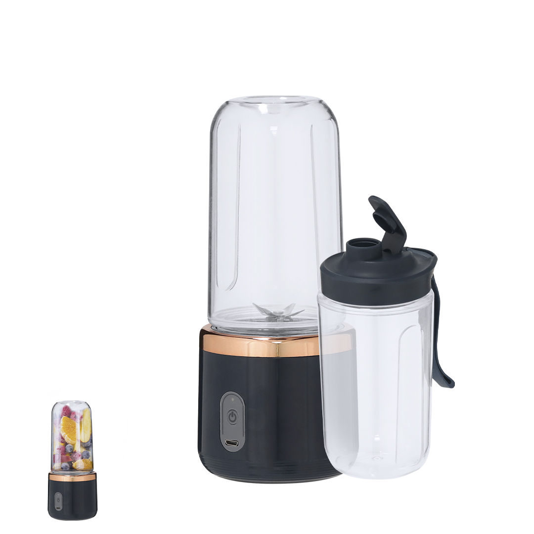 Set de licuadora y dos vasos portátiles. Licuadora de seis cuchillas de acero inoxidable, con cuerpo color solido con detalles en elegante oro rosa. Vasos portátiles con cuerpo transparente de 400 ml de capacidad y con tapas de cierre hermético y cierre de seguridad . Correa en la tapa para mejor sujección. Libre de BPA. Batería de 1.200 mAh de capacidad, con conexión USB-A a Micro USB (cable incluido). 2 Compartimentos 400 ml. Batería 1200 mAh