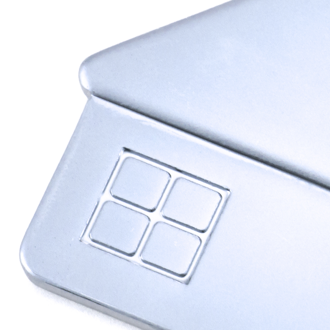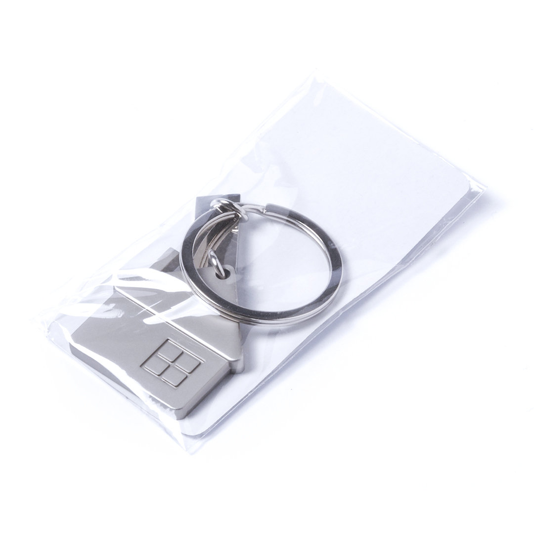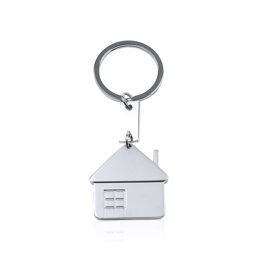 Llavero metálico con divertido diseño de casa en elegante acabado mate. Con cuerpo especialmente diseñado para marcaje en láser. Metal