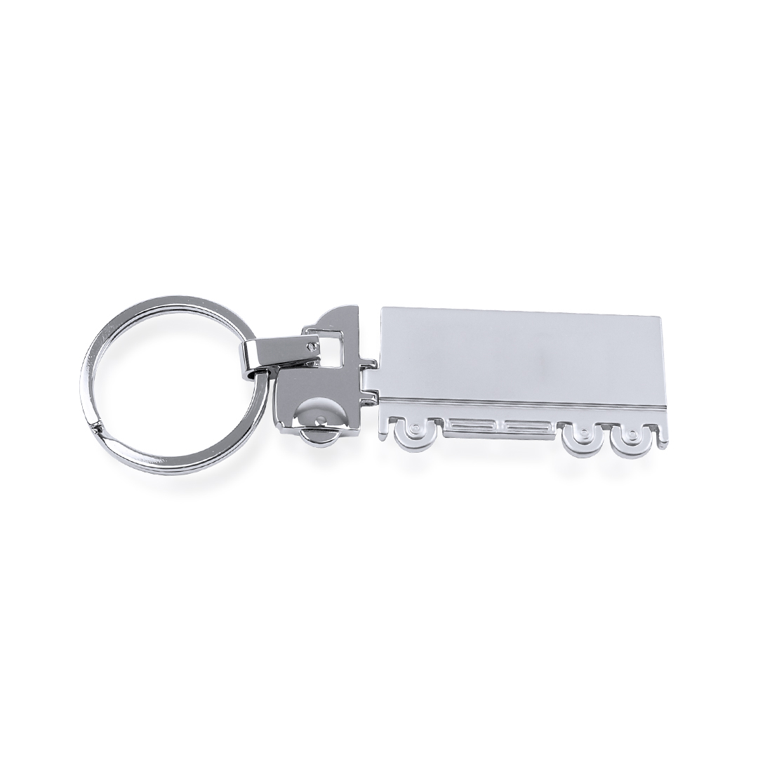Llavero metálico en divertido diseño de camión especialmente diseñado para marcaje en láser. Con cabina en acabado brillo y remolque en acabado mate.     Metal