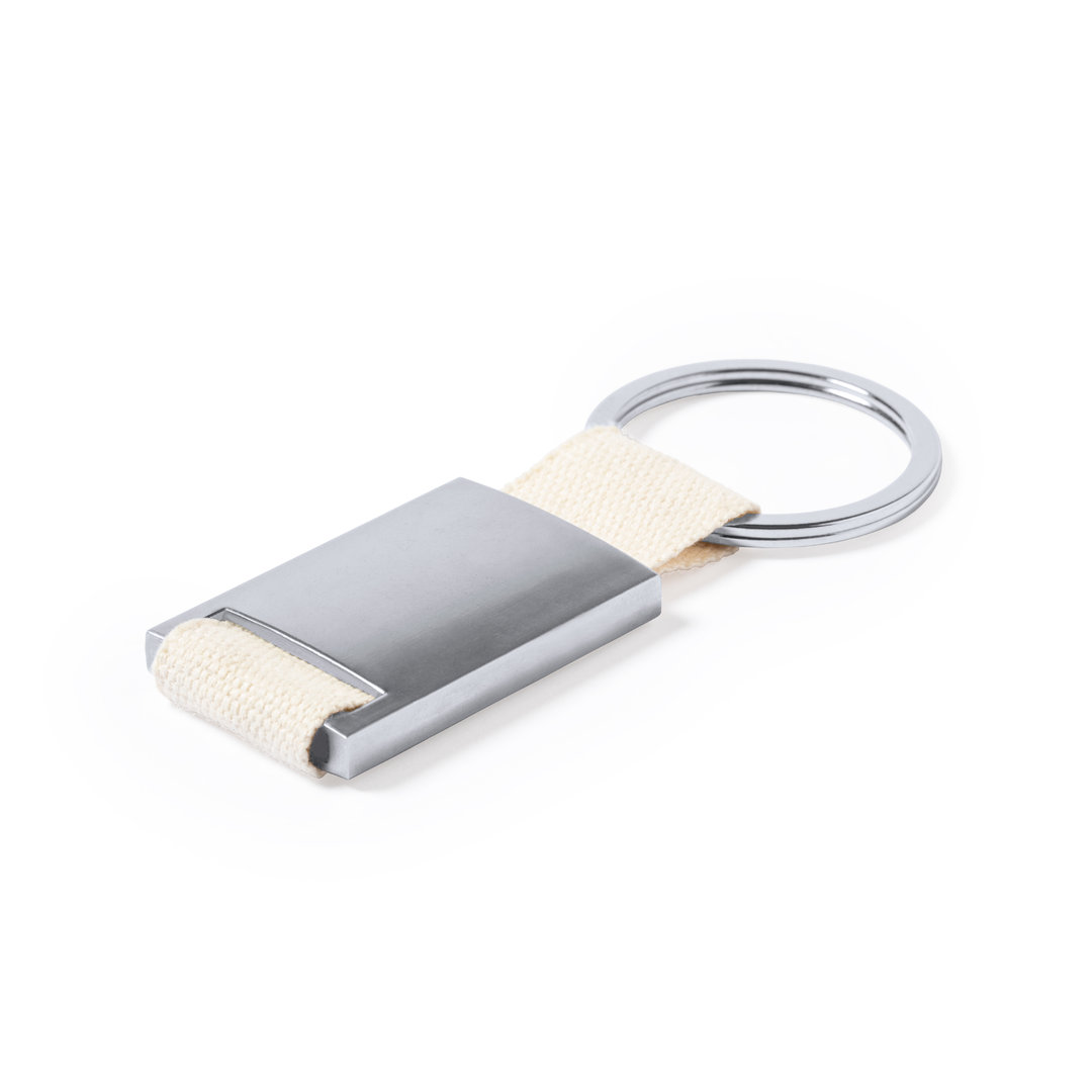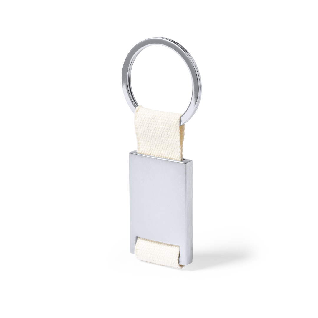 Llavero con cuerpo metálico de acabado plateado. Cinta 100% algodón de acabado natural. Amplia superficie de marcaje y anilla llavero metálica a juego. Presentado en bolsa individual con cartón interior kraft. Metal/ Algodón