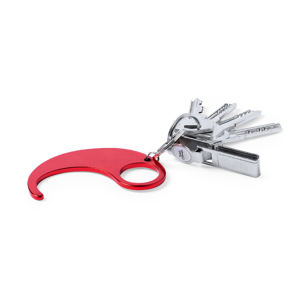 Llavero higiénico anti-contacto, fabricado en resistente Aluminio. El único llavero diseñado especialmente para uso en transporte público y evitar tocar con las manos superficies de uso común (picaportes de puertas, interruptores, grifos de uso público, cajeros automáticos…). Dispone de amplia zona de marcaje y cómodo troquel para el dedo. Acabado en aluminio en vivos y variados colores. Presentado en bolsita de diseño individual.     Aluminio