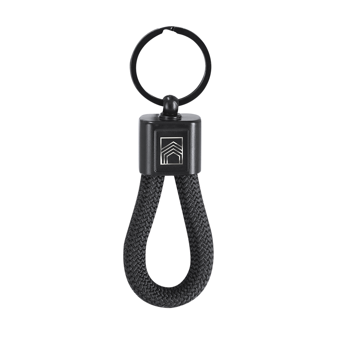 Elegante llavero con cordón de polyester. Incluye pieza central metalizada, especialmente diseñada para marcaje en láser con efecto espejo. Metal/ Poliéster