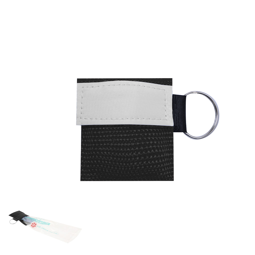 Llavero mascara para reanimación CRP, de formato compacto en una pequeña bolsa de poliéster 600 D con cierre de velcro y aro metálico para convertirse en llavero. Poliéster 600D