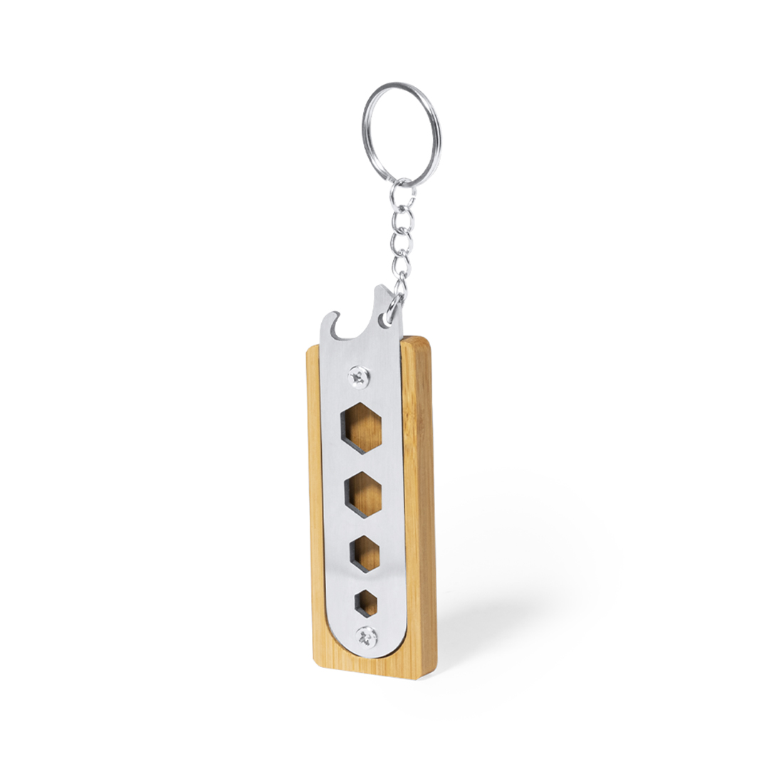 Llavero multiherramienta fabricado en resistente acero inox y bambú. Con práctico conjunto de 4 llaves fijas hexagonales troqueladas y abrebotellas. Presentado en caja individual de diseño kraft.   5 Funciones   Bambú/ Acero Inox