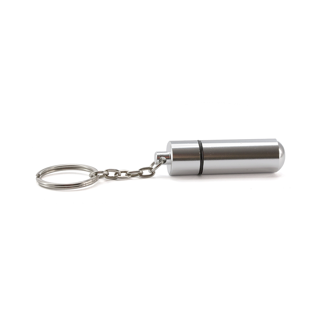 Llavero pastillero de discreto diseño con cuerpo en aluminio de acabado brillante y cierre a rosca. 1 Compartimento Aluminio