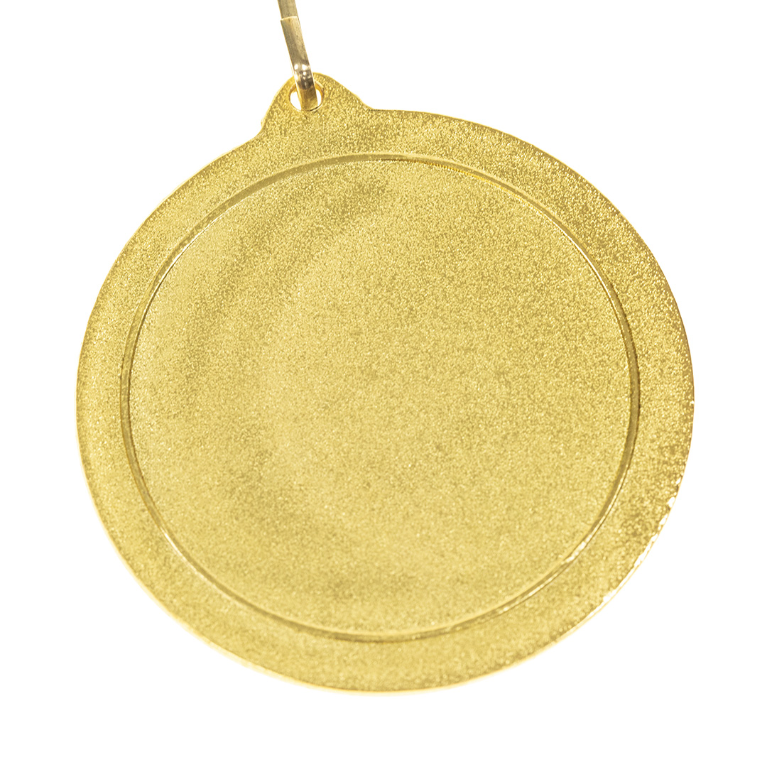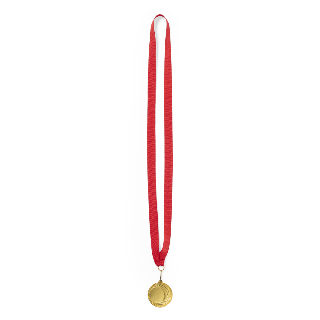 Medalla metálica de acabado dorado en relieve. Con cinta de poliéster en rojo, mosquetón metálico a juego y especialmente diseñada para marcaje en láser. Metal