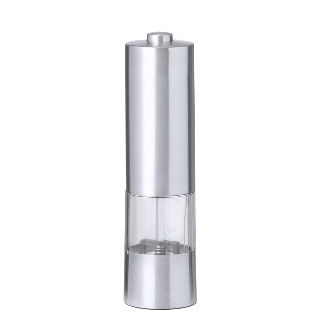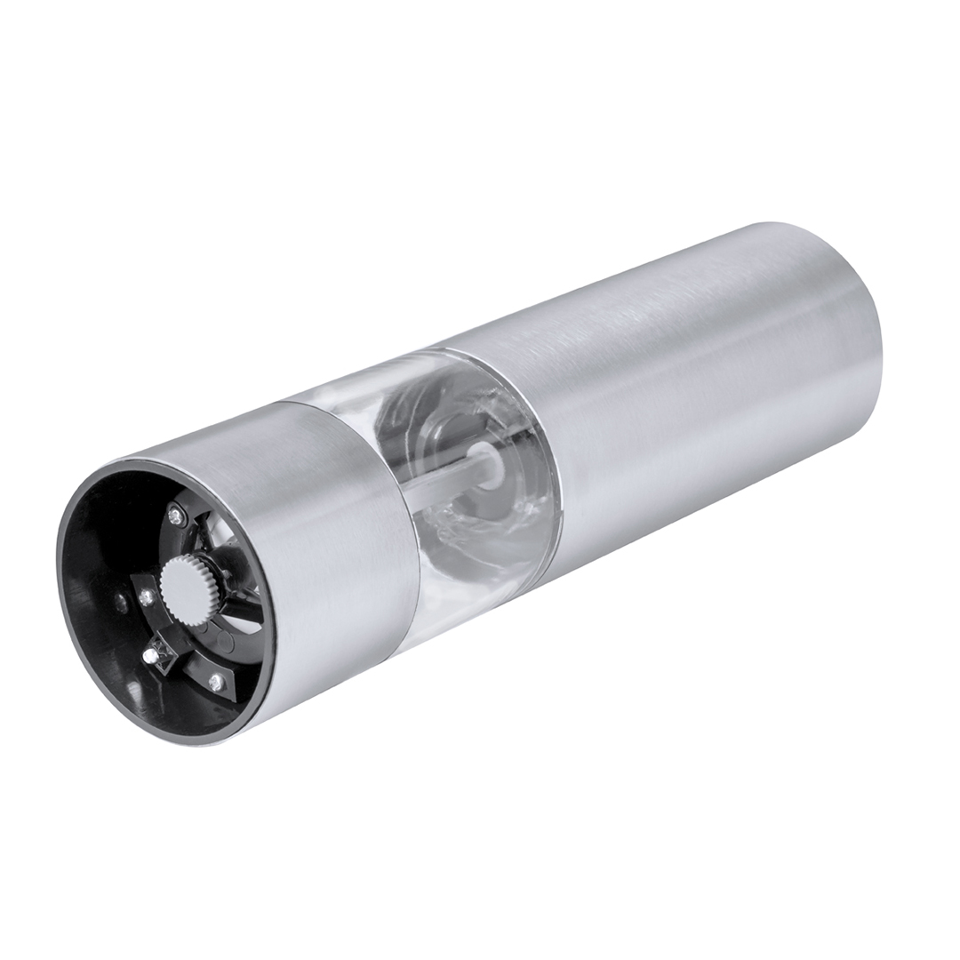 Molinillo eléctrico para sal y pimienta en acero inox. Ideal para agregar la especia más deseada en compartimento de 70 ml, condimentando al pulsar el botón superior pudiendo ajustar el tamaño del grano. Equipado con una ventana para visualizar la cantidad de especia que queda y con luz LED. Alimentado por 4 pilas AAA (no incluidas) y presentada en caja de diseño kraft. 1 Led. Molienda Regulable. 4 Pilas AAA No Incluidas Acero Inox