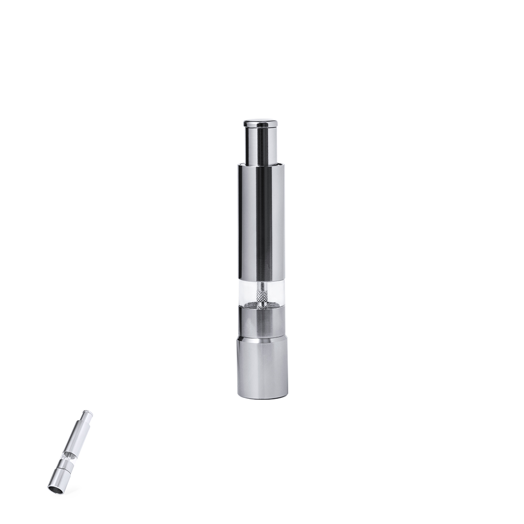 Molinillo manual para sal y pimienta fabricado en aluminio. Ideal para agregar la especia más deseada y utilizar con el picador manual en forma de pulsador. Cuenta con una ventana para visualizar el nivel. Presentado en caja de diseño kraft. Aluminio