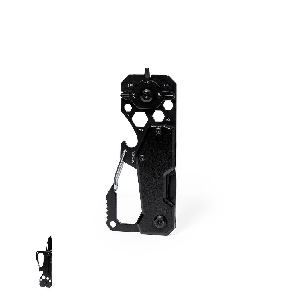 Excelente multiherramienta fabricada en aluminio y acero inox con acabado en color negro. Incluye 13 funciones diferentes: llave para tuercas hexagonales en varios tamaños, mosquetón, abrelatas, regla, rasqueta, cuchillo, destornilladores planos y philips. Presentada en caja de diseño kraft.   13 Funciones   Aluminio/ Acero Inox