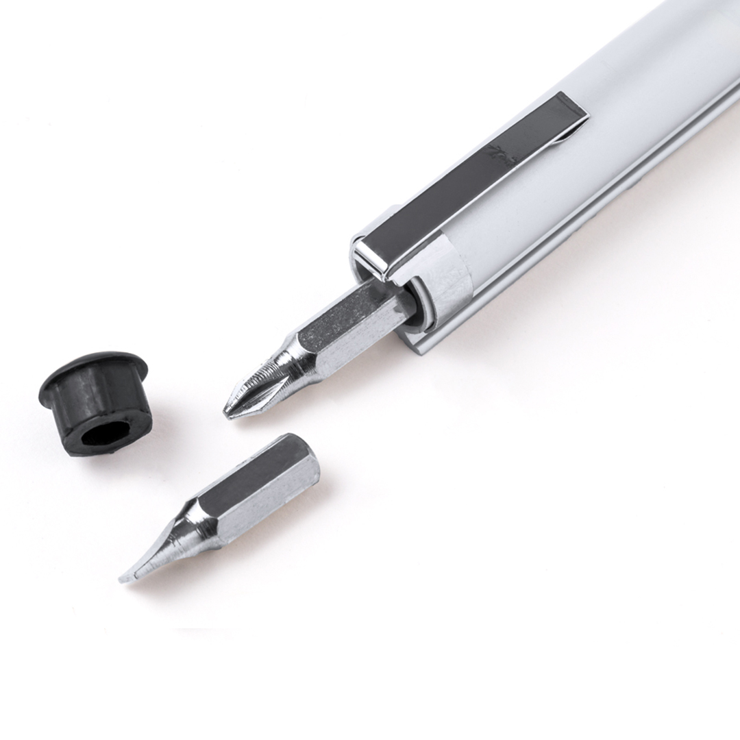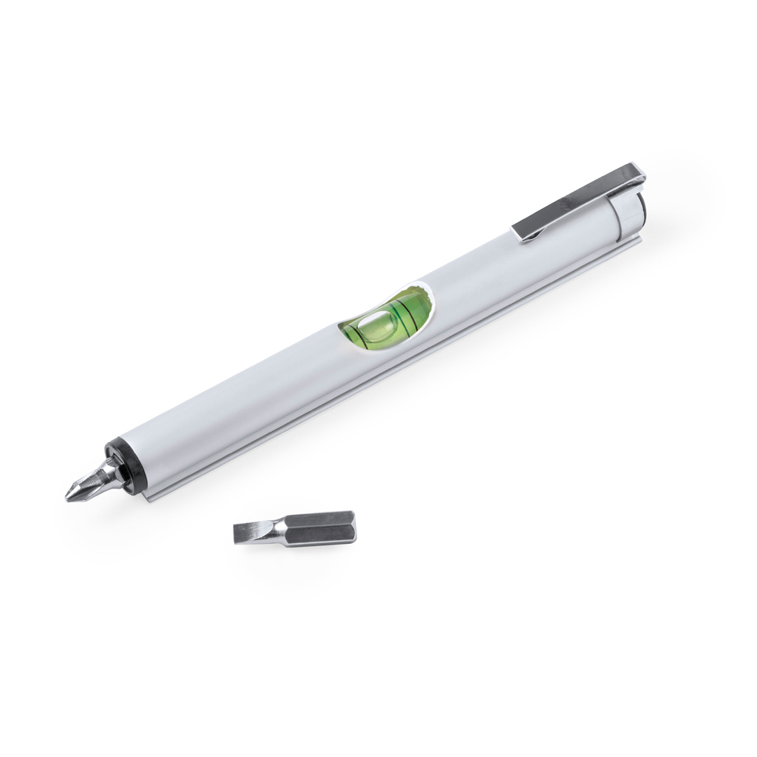 Práctica multiherramienta fabricada en aluminio, con nivel integrado en el cuerpo y dos cabezales para destornillador (plano y philips) en el interior. Con clip metálico de acabado cromado y presentada en caja de diseño kraft.   2 Accesorios. 3 Funciones   Aluminio