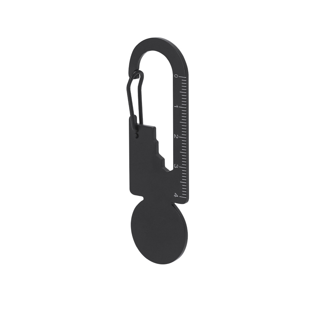 Multiherramienta de acero inoxidable y acabado negro mate. Diseñada para adaptarse a múltiples necesidades, incluye 8 funciones: llave para tuercas hexagonales en varios tamaños, regla para mediciones, abrebotellas, moneda para carro de compra, etc. Con cierre de mosquetón. 8 Funciones Acero Inox