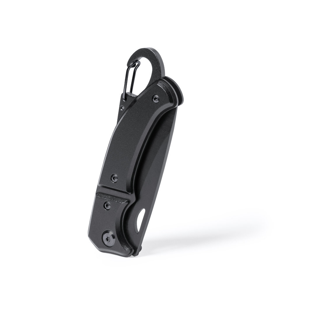 Navaja con hoja en acero inox de acabado negro y resistente empuñadura a juego en aluminio. Con mosquetón integrado en mango y bloqueo de seguridad. Con troquelado en hoja para una fácil apertura y presentada en caja individual de diseño negra. Con Bloqueo Aluminio/ Acero Inox