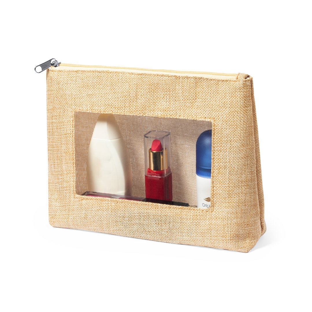 Neceser de inspiración nature con ventana en un lado. Con cierre de cremallera a juego y de acabado cosido. Fabricado en poliéster de tono crudo, con ventana en EVA transparente. Poliéster/ EVA
