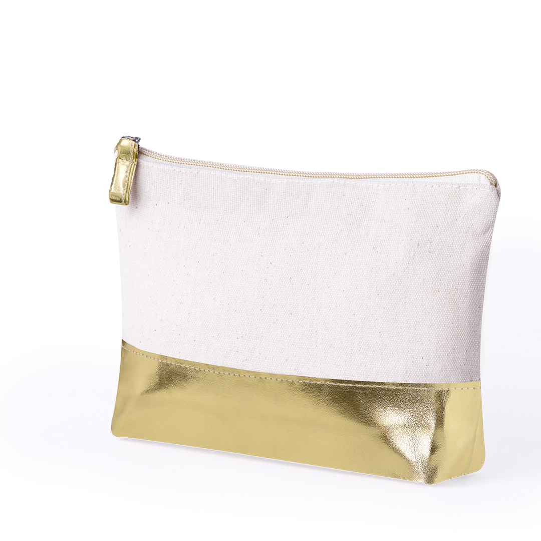 Neceser en material 100% algodón reciclado de 220 g/m2. Con cierre de cremallera a juego con la base. Disponible en color natural con base de color metalizado en polipiel. Polipiel/ Algodón