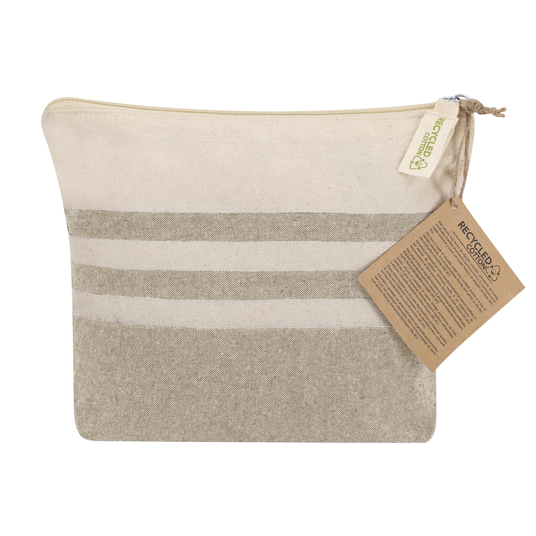 Neceser fabricado principalmente en algodón reciclado 180 g/ m2 en elegante tono natural con diseño a rayas horizontales. Compartimento principal con cierre de cremallera. Incluye etiqueta exterior con logotipo algodón reciclado. Algodón Reciclado/ Poliéster RPET 180 g/ m2