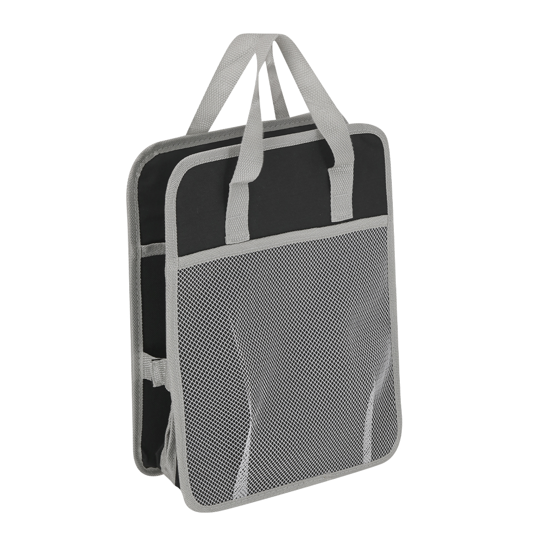 Organizador plegable fabricado en poliéster RPET 600D. Ideal para el maletero del coche. Con asas de transporte reforzadas, bolsillo frontal de malla en color gris y cintas en los laterales de velcro para mejor ajuste. Interior con tres compartimentos de almacenaje. El material RPET se elabora a partir de plástico reciclado, para así fomentar la reutilización de residuos plásticos y ayudar a la sostenibilidad del planeta. Plegable Poliéster 600D RPET