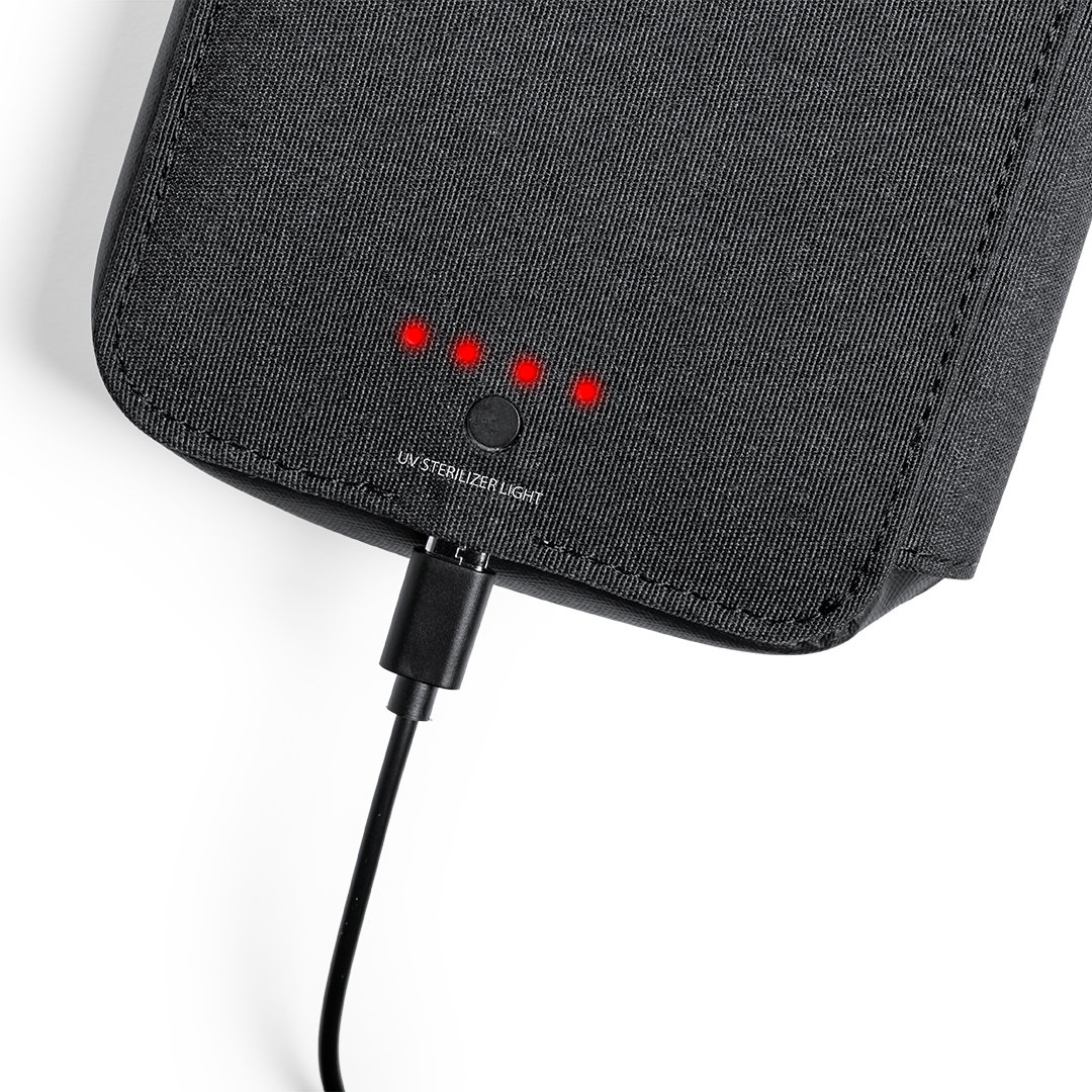 Organizador y esterilizador de luz ultravioleta tipo C, con protección RFID (Identificación por Radio Frecuencia) que mantiene seguros tus dispositivos de transmisión de identidad. Especialmente diseñado para la eliminación de microorganismos y bacterias en smartphones y otros objetos de uso cotidiano. Fabricada en resistente poliéster 600D de acabado denim, con cierre magnético de seguridad en tirador para un uso seguro del dispositivo. Incluye 4 tarjeteros interiores + bolsillo exterior. Presentado en atractiva caja individual de diseño. Potencia LED 1.2W y longitud de onda 275nm. Tiempo de esterilización con función auto-apagado de 1 y 3 minutos. Disponible manual de usuario en español e inglés. Disponible certificación CE, RoHS y de efectividad germicida. Para un uso adecuado del producto, evitar el contacto con la piel y los ojos. Luz Ultravioleta. Protector RFID. Conexión USB Poliéster 600D/ PU