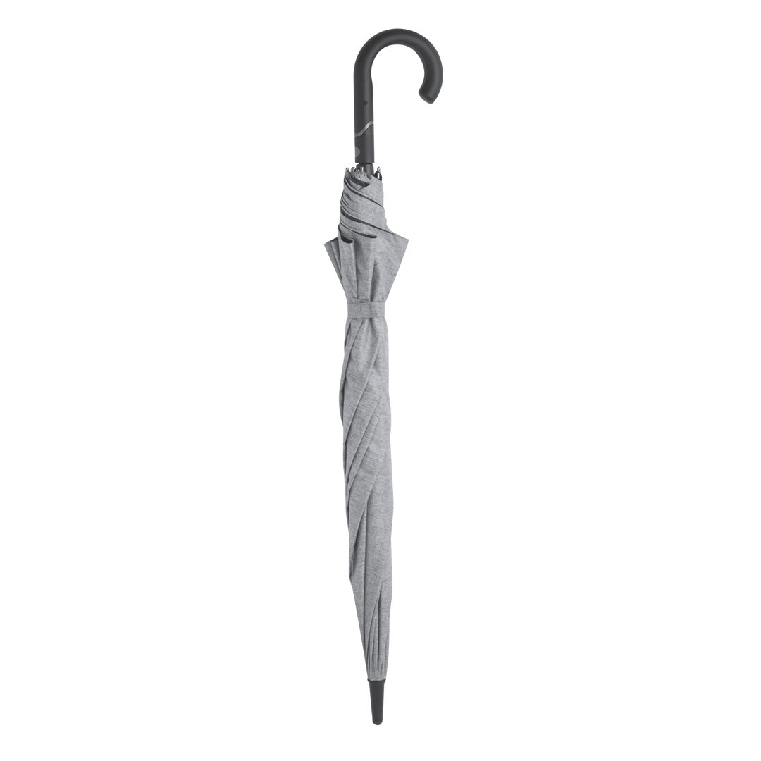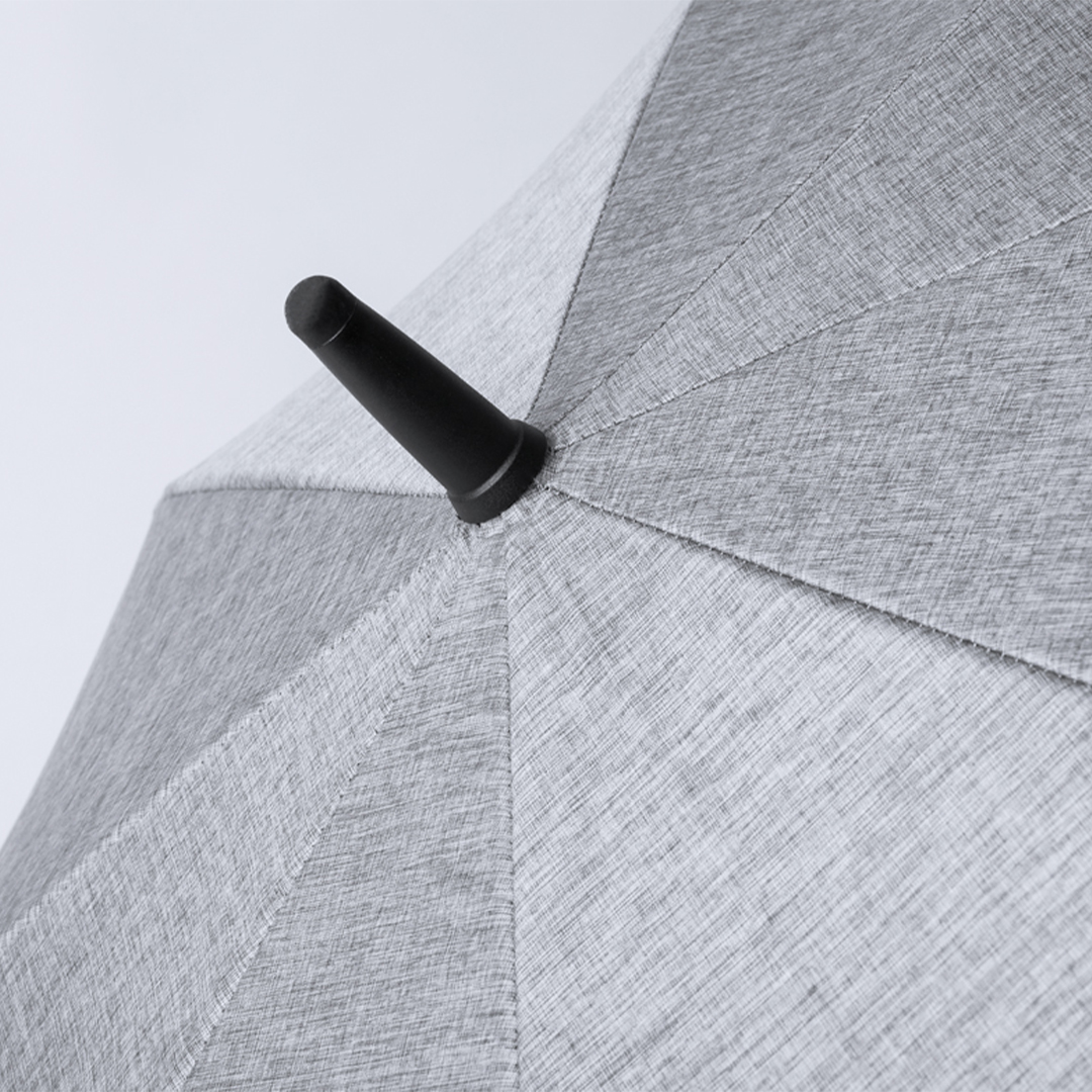 Paraguas de alta calidad y 130cm de diámetro, fabricado en material poliéster 150D y en elegante tono gris jaspeado. Apertura automática y varillas de fibra de vidrio, con sistema antiviento y cierre de velcro. Con mango ergonómico en suave ABS y presentado en bolsa reciclada. 30″. Automático. Sistema Antiviento Poliéster 150D. Varillas Fibra de Vidrio