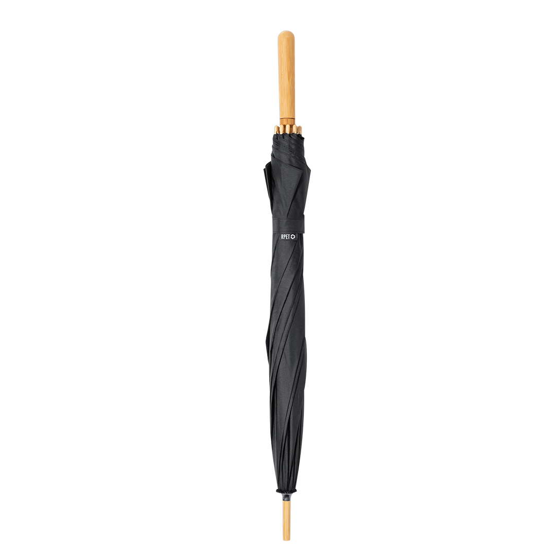 Paraguas de 140cm de diámetro en material pongee 190T RPET. Apertura manual y varillas de fibra de vidrio antiviento, de elegante color negro con cierre de velcro. Mango recto hecho en bambú y etiqueta distintiva RPET.El material RPET se elabora a partir de plástico reciclado, para así fomentar la reutilización de residuos plásticos y ayudar a la sostenibilidad del planeta. 23″. Sistema Antiviento. Mango y Caña Bambú Pongee 190T RPET. Varillas Fibra de Vidrio