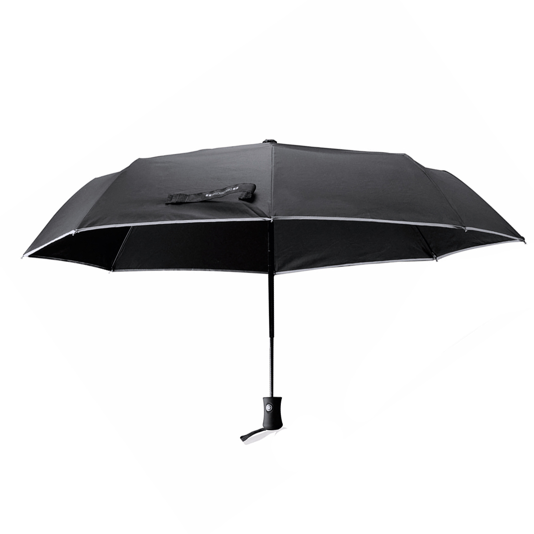 Paraguas plegable de Antonio Miró, de 8 paneles y elegante diseño en color negro con ribetes en color blanco. De 95cm de diámetro, con mecanismo automático de apertura y cierre, sistema antiviento y en resistente material pongee. Con varillas metálicas en color negro, cierre de velcro y mango ergonómico con cinta de transporte. Presentado en funda individual a juego con logotipo de la marca. 21″. Apertura y Cierre Automáticos. Sistema Antiviento. Funda Poliéster Pongee 190T. Varillas Fibra de Vidrio