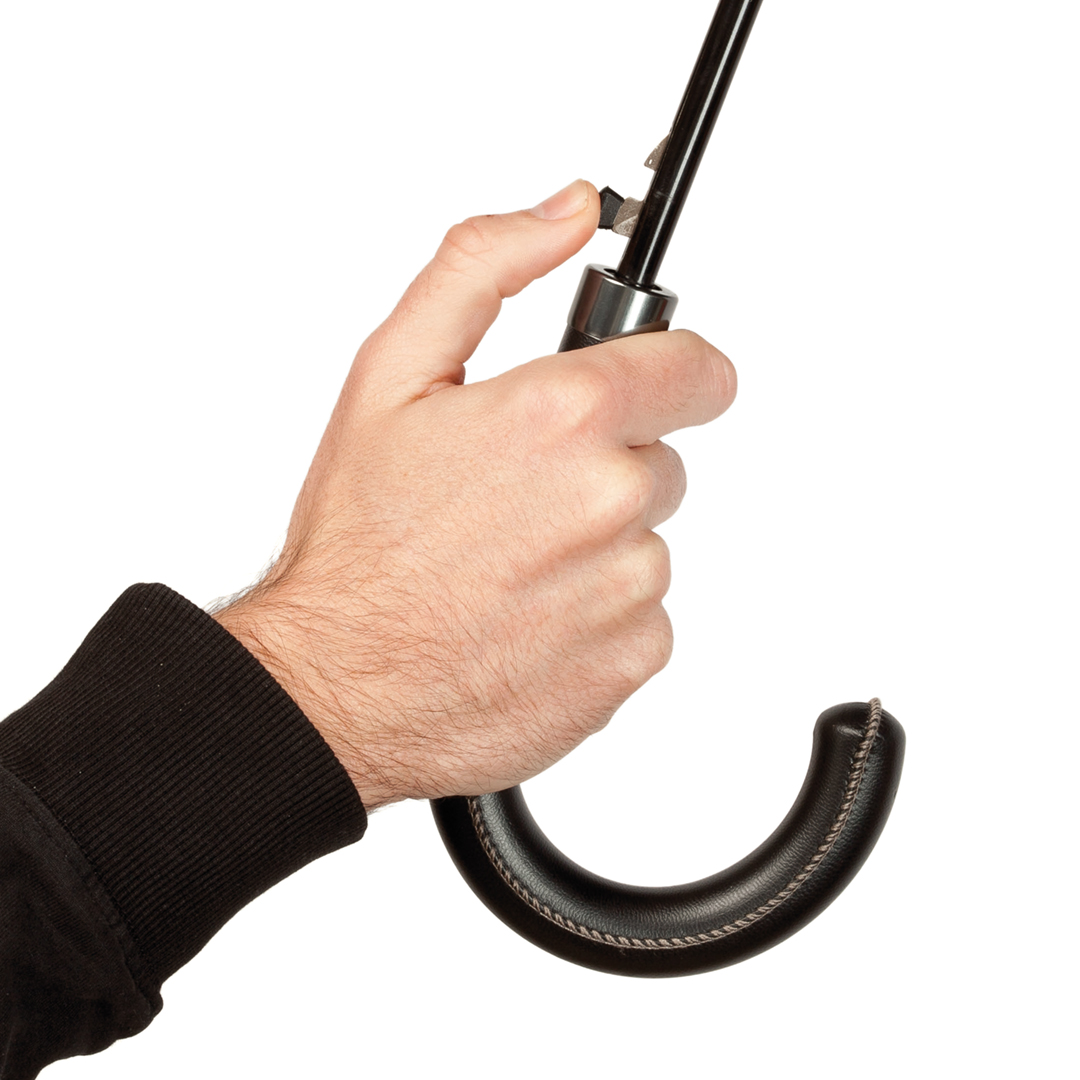 Paraguas de Antonio Miró de 8 paneles, con elegante diseño en color negro con ribetes en color blanco. De 100cm de diámetro, con apertura automática y en resistente material pongee. Con varillas metálicas en color negro, cierre de velcro y mango de suave tacto en polipiel. Presentado en funda con logotipo de la marca y cinta con accesorio de ajuste. 22″. Automático. Mango Polipiel. Funda Pongee Pongee 190T. Varillas Metal