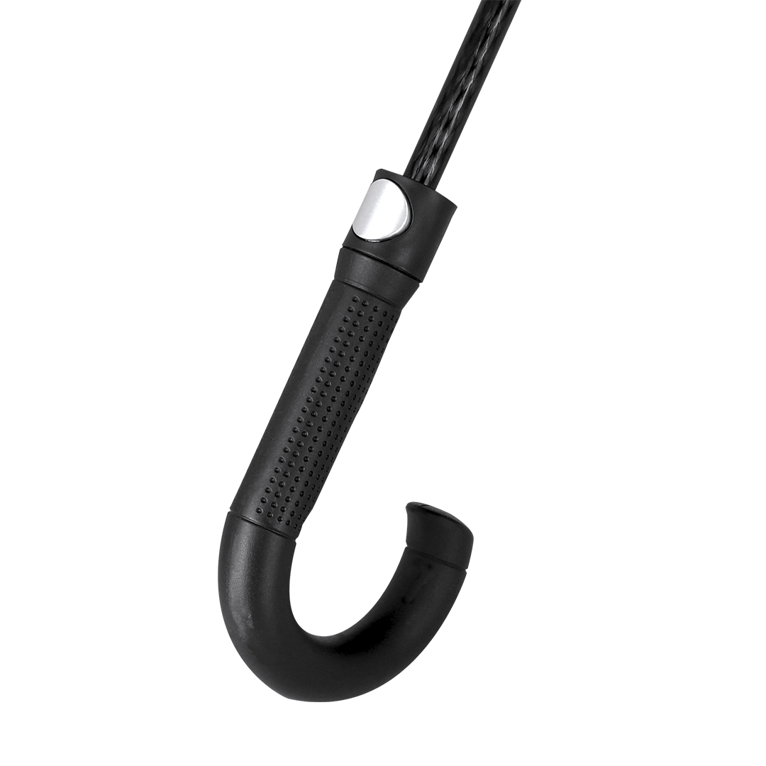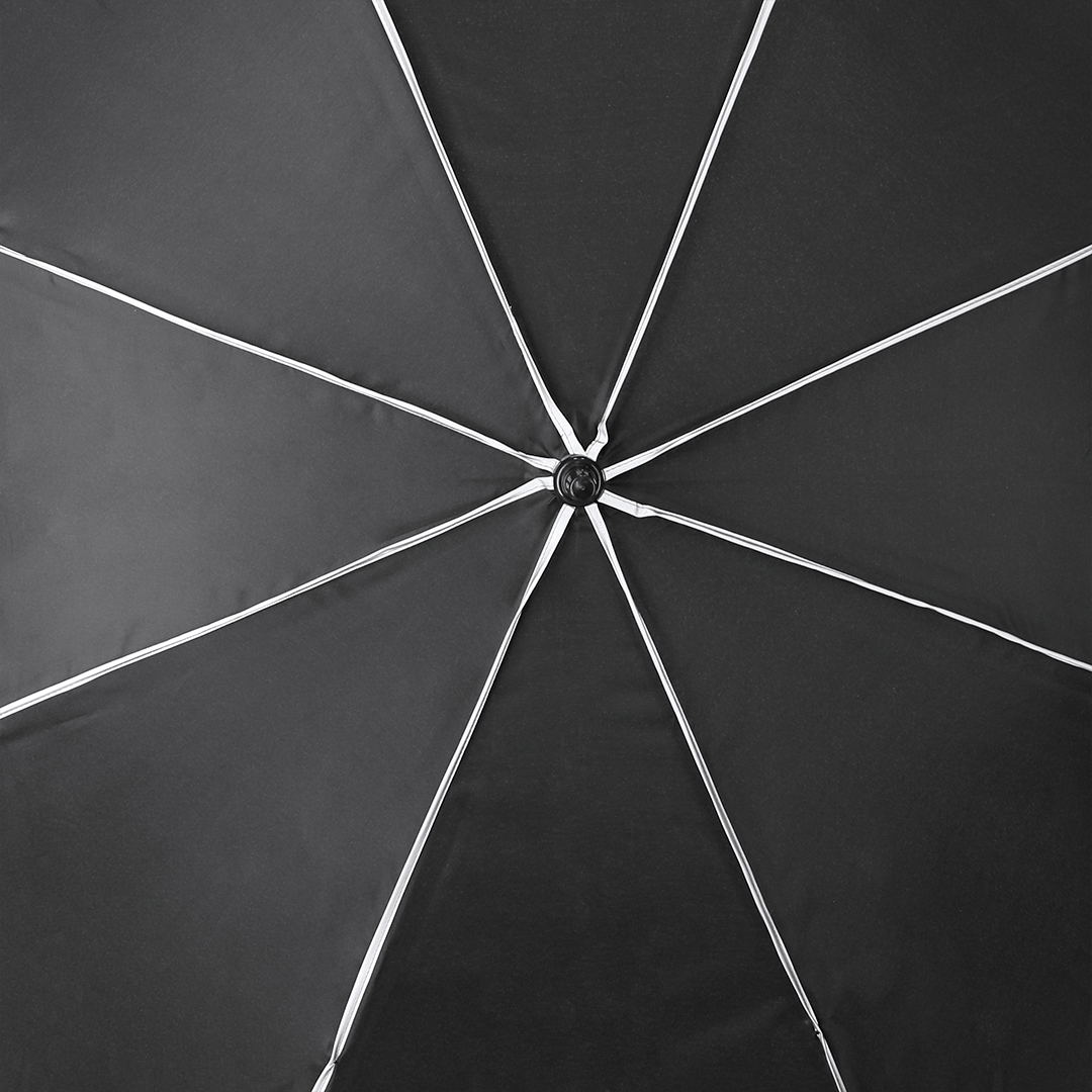 Paraguas antiviento fabricado en RPET 190T de 8 paneles, con elegante diseño en color negro con ribetes reflectantes. De 120cm de diámetro, con apertura automática y en resistente material pongee. Con varillas en fibra de vidrio en color negro, cierre de velcro y mango en PP. Incluye funda con correa ajustable para fácil transporte y distintiva etiqueta RPET. 27″. Automático. Sistema Antiviento. Reflectante. Funda Pongee RPET Pongee 190T RPET. Caña y Varillas Fibra de Vidrio