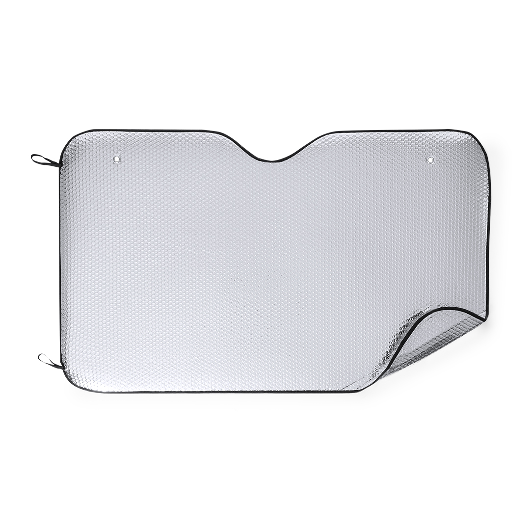 Parasol en aluminio con burbuja en ambas caras en color plateado de acabado metalizado con ribetes en color negro. De tamaño 130x80cm, con argollas metálicas de refuerzo, cintas elásticas para plegado, dos ventosas para ajuste en luna y presentación desplegado en plancha para fácil impresión. Aluminio Burbuja Dos Caras