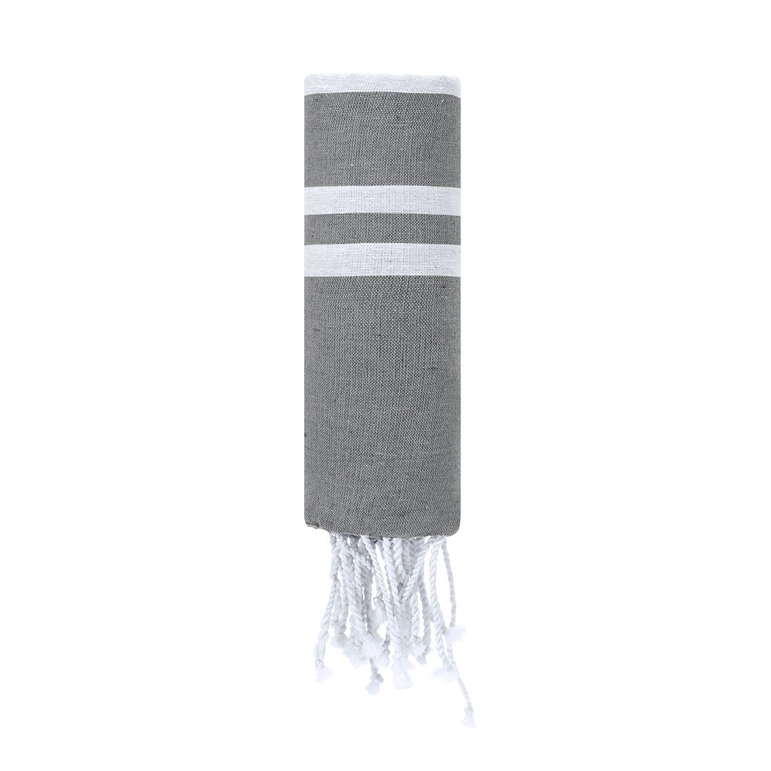 Suave pareo-toalla de 150g/m2 en combinación de algodón y poliéster. Su diseño cuenta con una base en color y rayas blancas, .Incluye flecos en los extremos que añaden un detalle decorativo y que completan su acabado.     80% Algodón/ 20% Poliéster 150 g/ m2