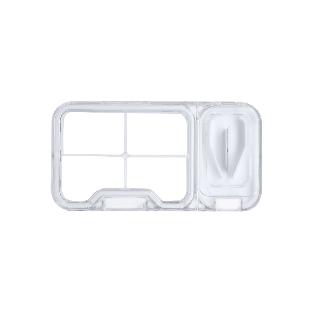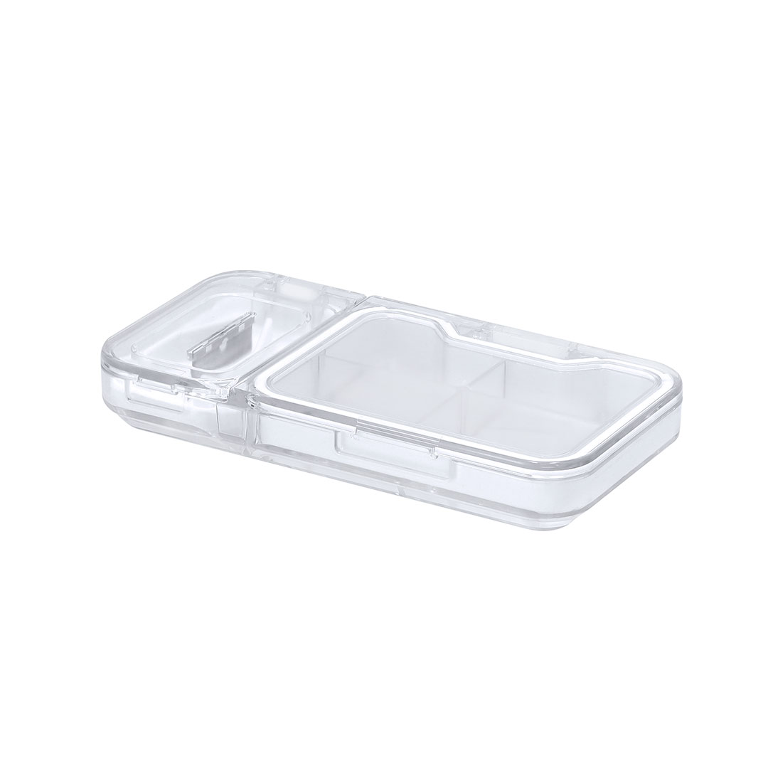 Pastillero con 4 compartimentos interiores, cierre de seguridad con bordes de silicona y cuchilla para partir pastillas. Fabricado con un acabado transparente.   4 Compartimentos
