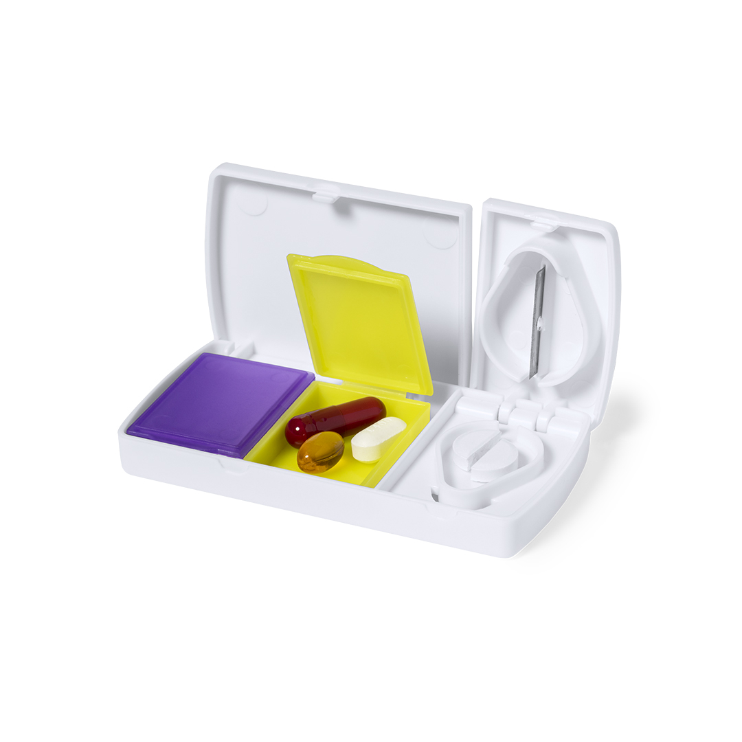 Pastillero en suave y resistente material acabado en color blanco. Con 2 cajitas interiores, cierre de seguridad y cuchilla para partir pastillas. 2 Compartimentos