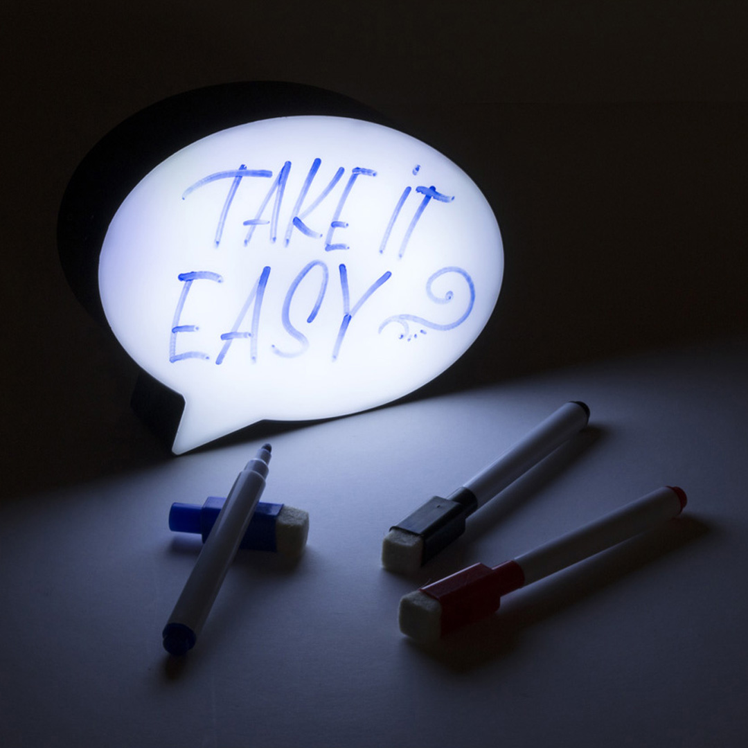Divertida pizarra bocadillo con interior iluminado por 8 ledes. Con botón ON/OFF y tres rotuladores con borrador en colores azul, negro y rojo incluidos. Alimentación a pilas: 3xAAA no incluidas y presentada en atractiva caja de diseño. Luces Led. 3 Rotuladores y Borradores Incluidos. 3 Pilas AAA No Incluidas