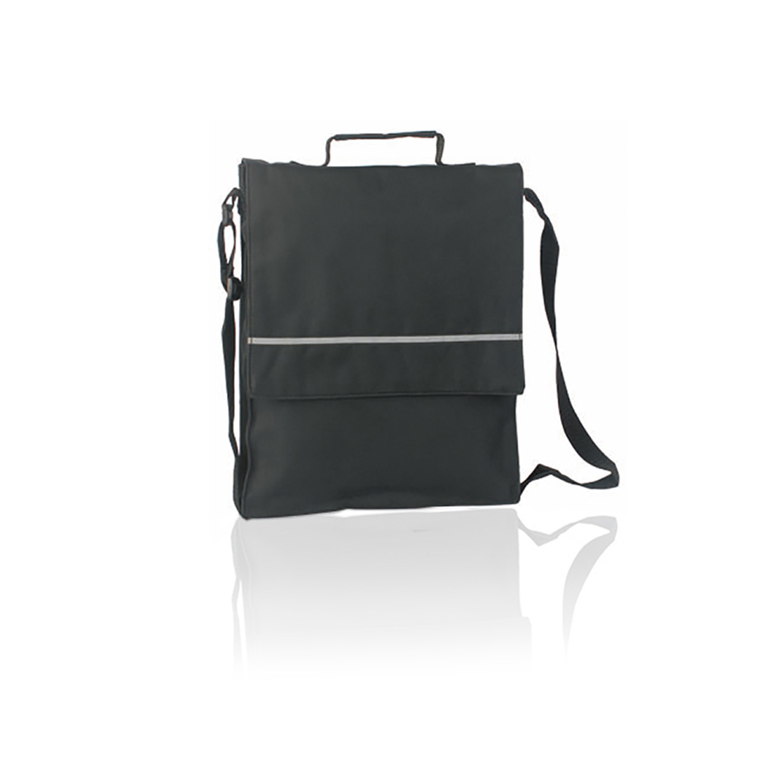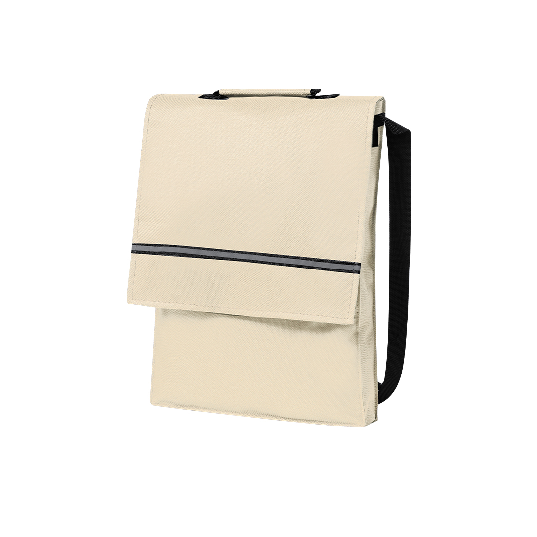 Portadocumentos con solapa de cierre de velcro en poliéster 600D de vivos colores y con franja frontal reflectante. Con asas reforzada a juego, cinta bandolera ajustable y compartimentos interiores con fundas para bolígrafos y smartphone. Poliéster 600D