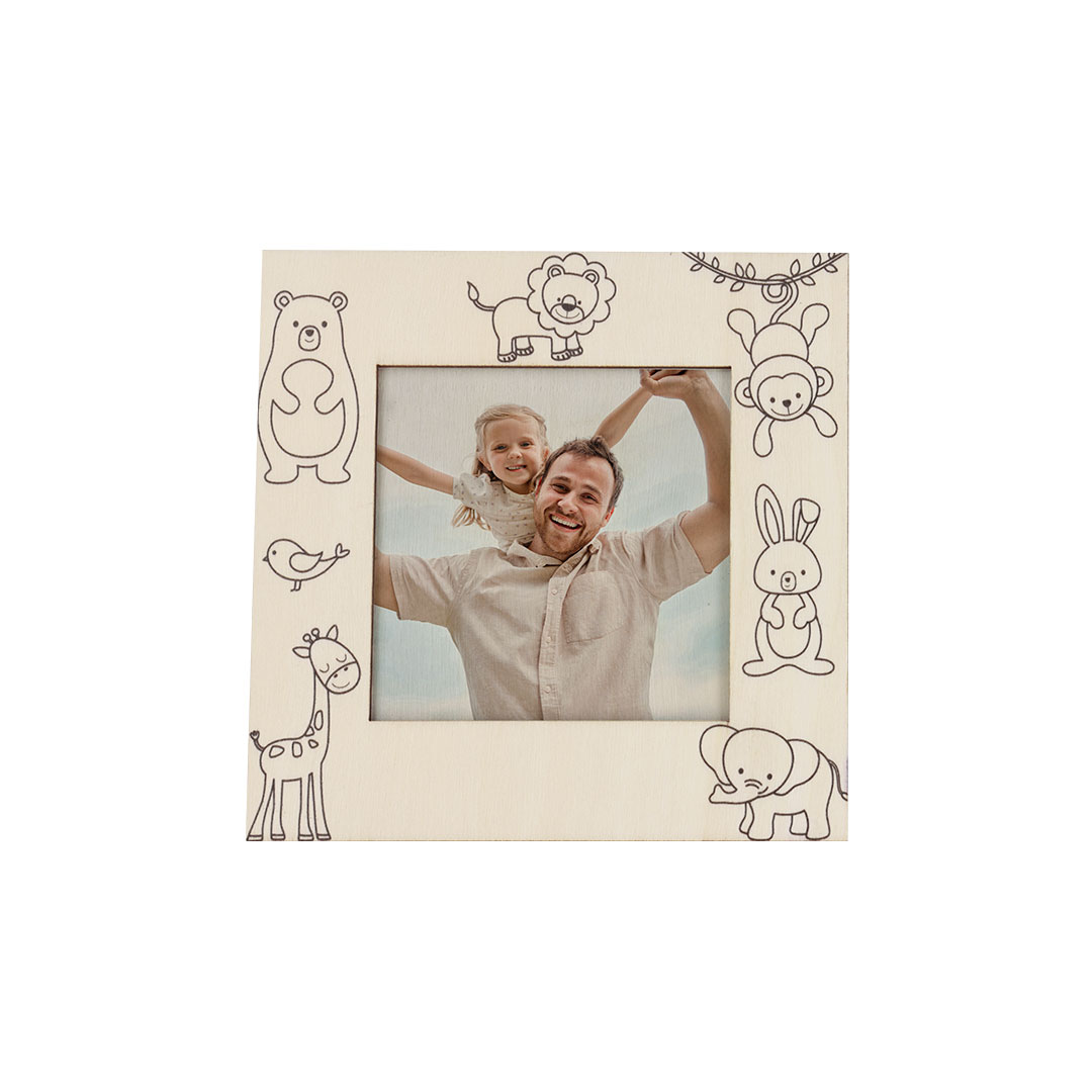 Marco de fotos fabricado en madera natural con diseño de animales. Incluye ceras de colores para personalizar y decorar el marco. Diseñado para fotografías de 7,5×7,5 cm. Cuenta con práctico soporte trasero de bisagra. Fotos: 7,5 x 7,5 cm. 5 Ceras Incluidas Madera