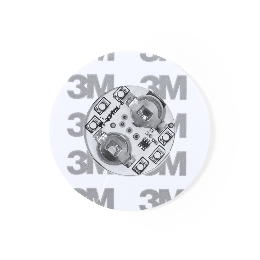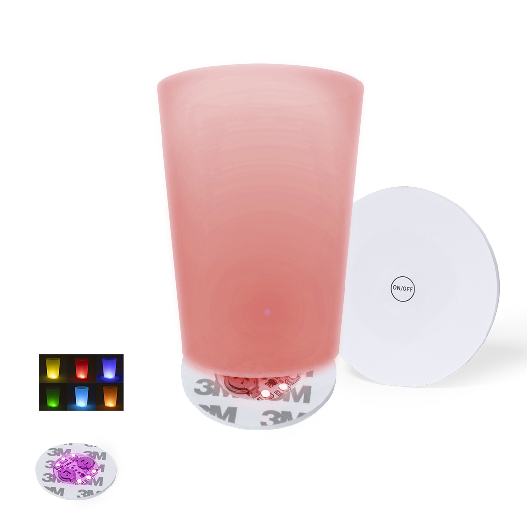 Original posavasos con 6 LEDs para iluminar las bebidas. Con botón en la base y diferentes posiciones de iluminación: en colores fijos o variados. Se fija a la base de cualquier bebida con cinta autoadhesiva y está alimentado por dos pilas de botón (incluidas).   Luces Led Multicolor. 2 Posiciones de Luz, Fija e Intermitente. Adhesivo. Pilas Botón Incluidas
