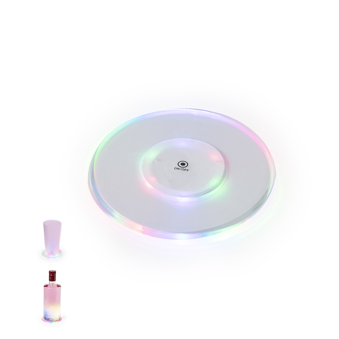 Original posavasos con 6 LEDs para iluminar las bebidas. Con botón en la base y 3 posiciones de iluminación (luz fija y luz intermitente rápida o lenta) . Se fija a la base de cualquier bebida con cinta autoadhesiva y está alimentado por dos pilas de botón (incluidas). Luces Led Multicolor. 3 Posiciones de Luz, Fija e Intermitente. Pilas Botón Incluidas Acrílico
