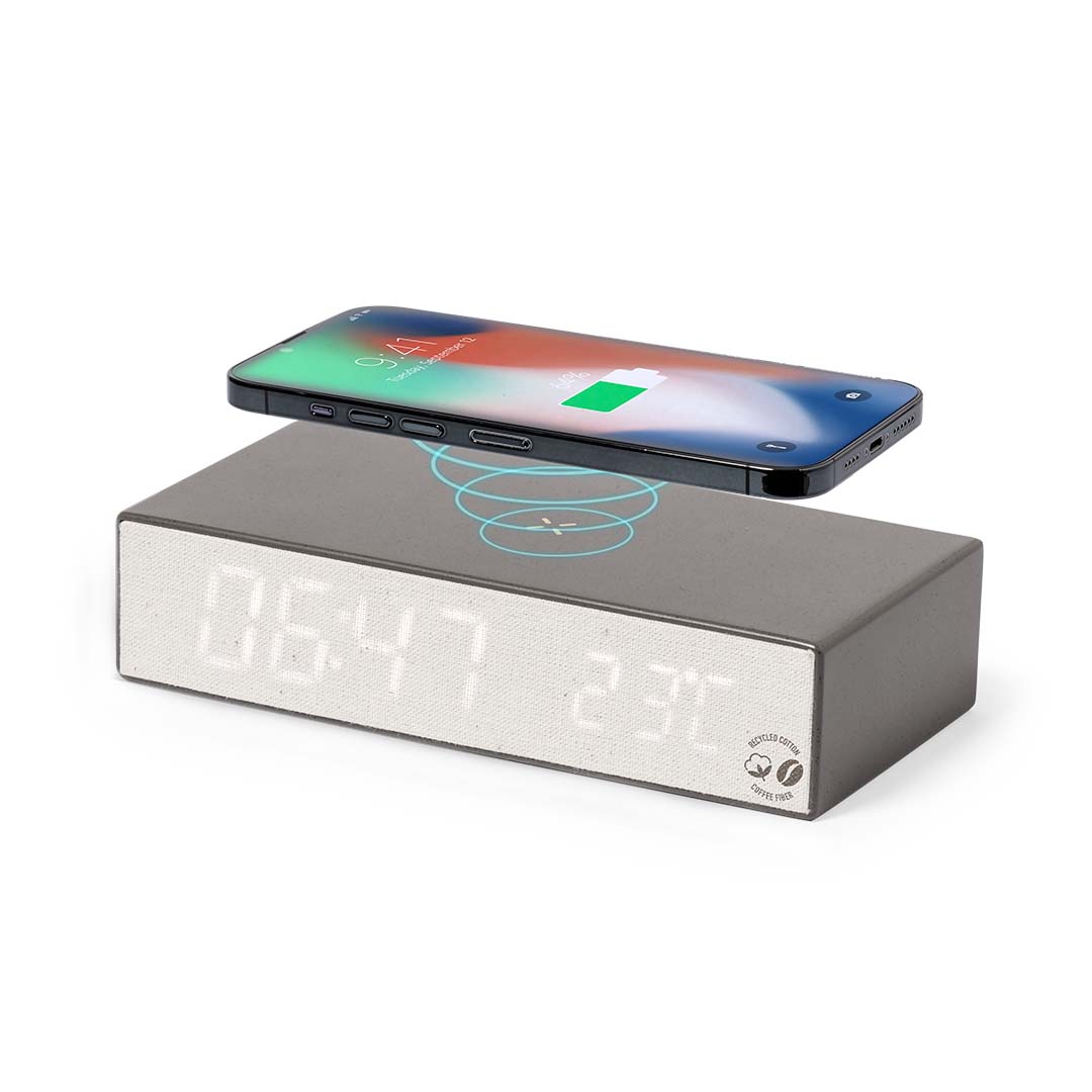 Reloj multifunción con cargador inalámbrico 10W integrado. Fabricado en en fibra de café y algodón reciclado. Función hora (12/24h), alarma, con intensidad de luz regulable. Alimentación mediante conexión USB. Compatible con dispositivos equipados con tecnología de carga inalámbrica y presentado en atractiva caja de diseño kraft. Con distintivo de fibra de café y algodón reciclado. Incluye manual de instruccions en español e inglés.La fibra de café es una solución circular que se obtiene de la utilización de los residuos producidos en la obtención del café. Una alternativa sostenible que favorece la reducción del uso de plásticos, ahorrando energía en su proceso de fabricación y contribuyendo al cuidado del medio ambiente.Disponible certificación GRS (Global Recycled Standard / Estándar de Reciclaje Global), que garantiza el origen reciclado del material usado para fabricar el producto.   Cargador Inalámbrico 10W. Intensidad de Luz Regulable. Conexión USB   Fibra de Café/ ABS/ Algodón Reciclado