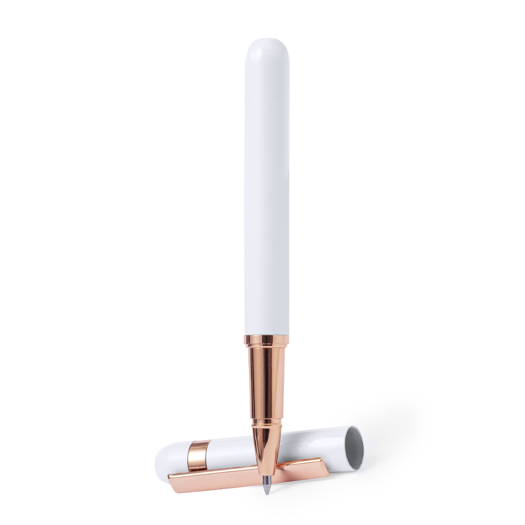 Elegante roller especialmente diseñado para el marcaje en láser con logotipo en color rosado. Con clip metálico y detalles plásticos en acabado rosado. Con cartucho jumbo, en tinta azul y cierre con capucha. Disponible en dos distintivos colores.Presentado en elegante caja de diseño negra. Carga Jumbo Aluminio/ ABS/ Metal