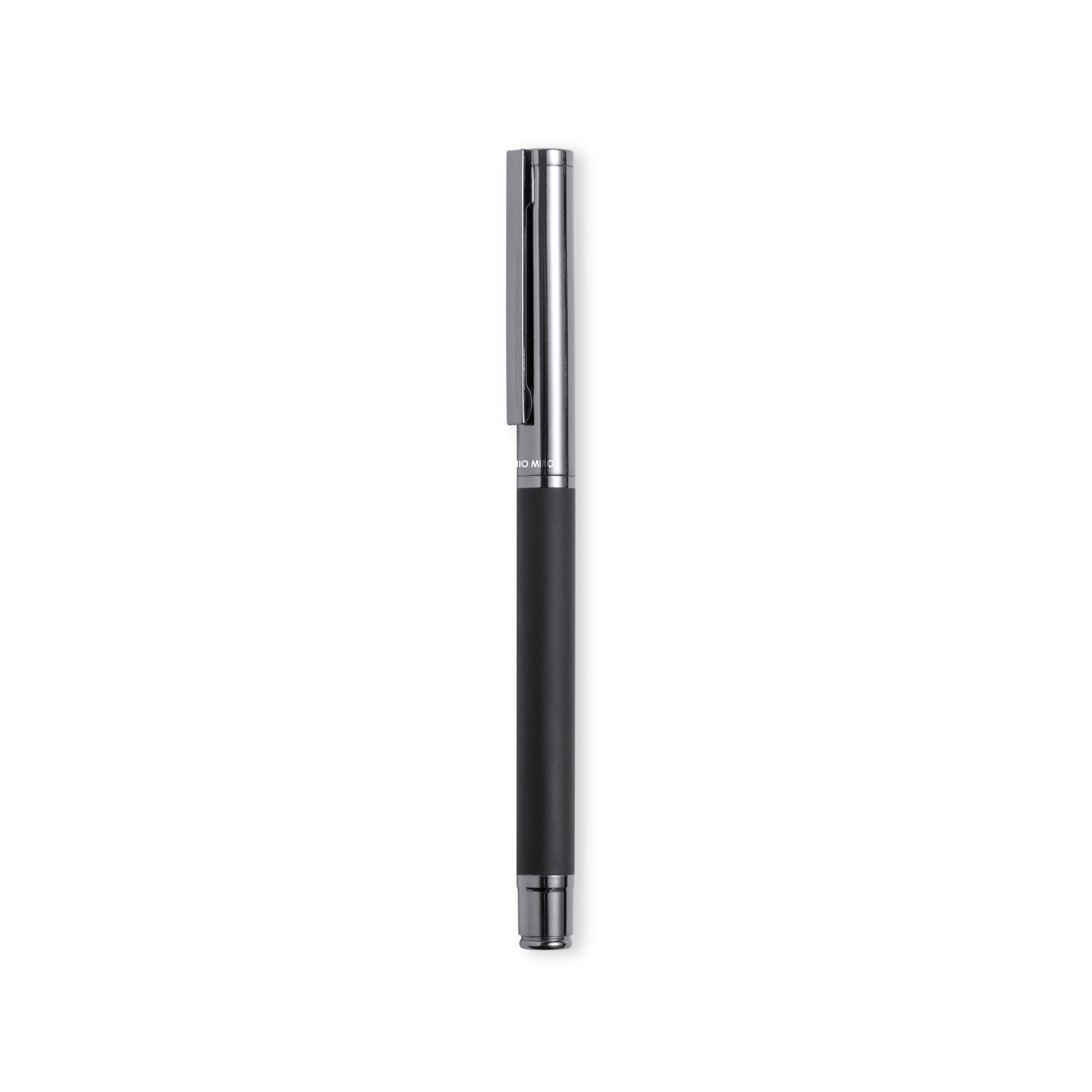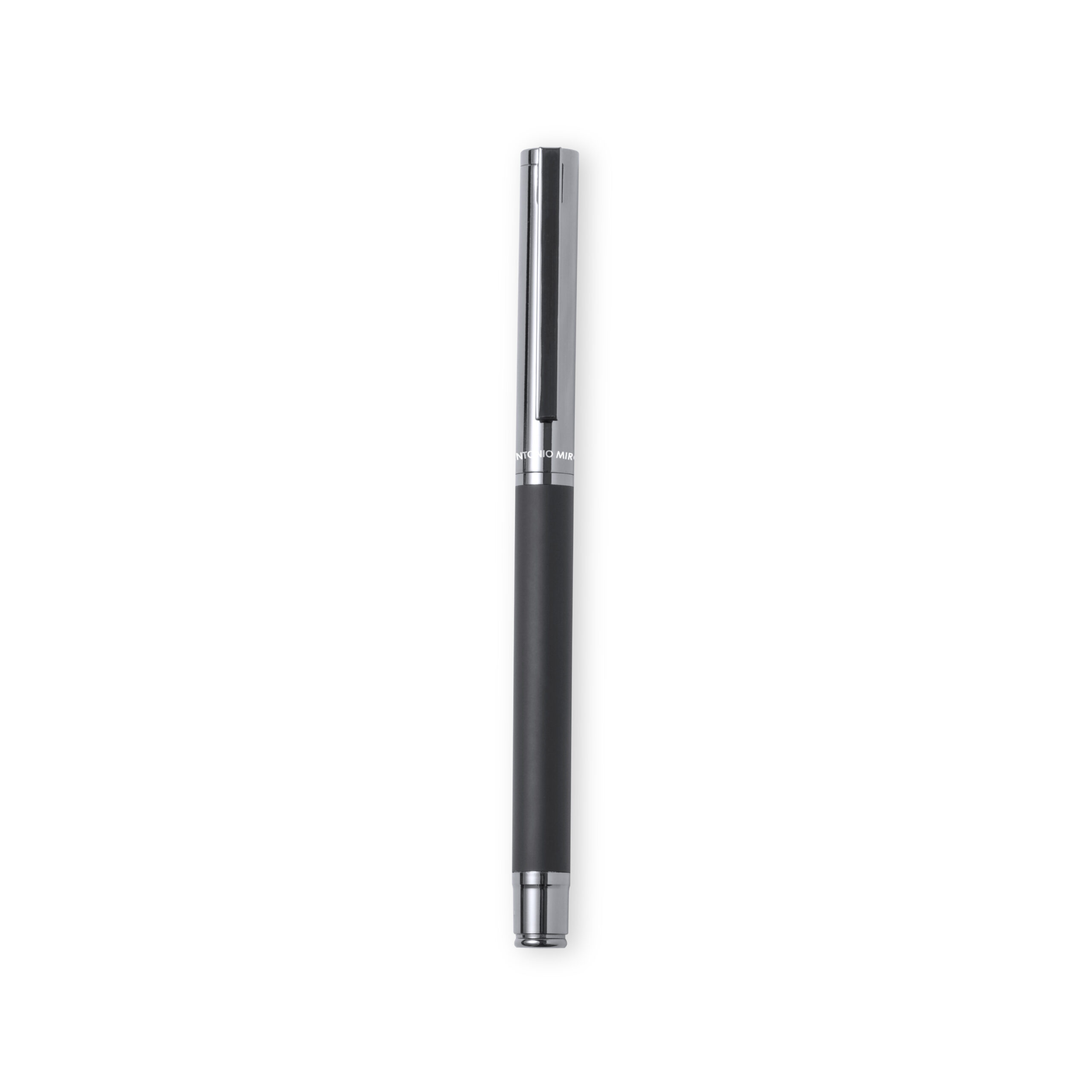 Roller de Antonio Miró fabricado en metal, con cuerpo en negro mate. Detalles y capucha en cromado con logotipo de la marca. De cartucho jumbo y en tinta azul. Presentado en elegante y resistente caja individual negra con logotipo Antonio Miró y funda a juego. Carga Jumbo Metal