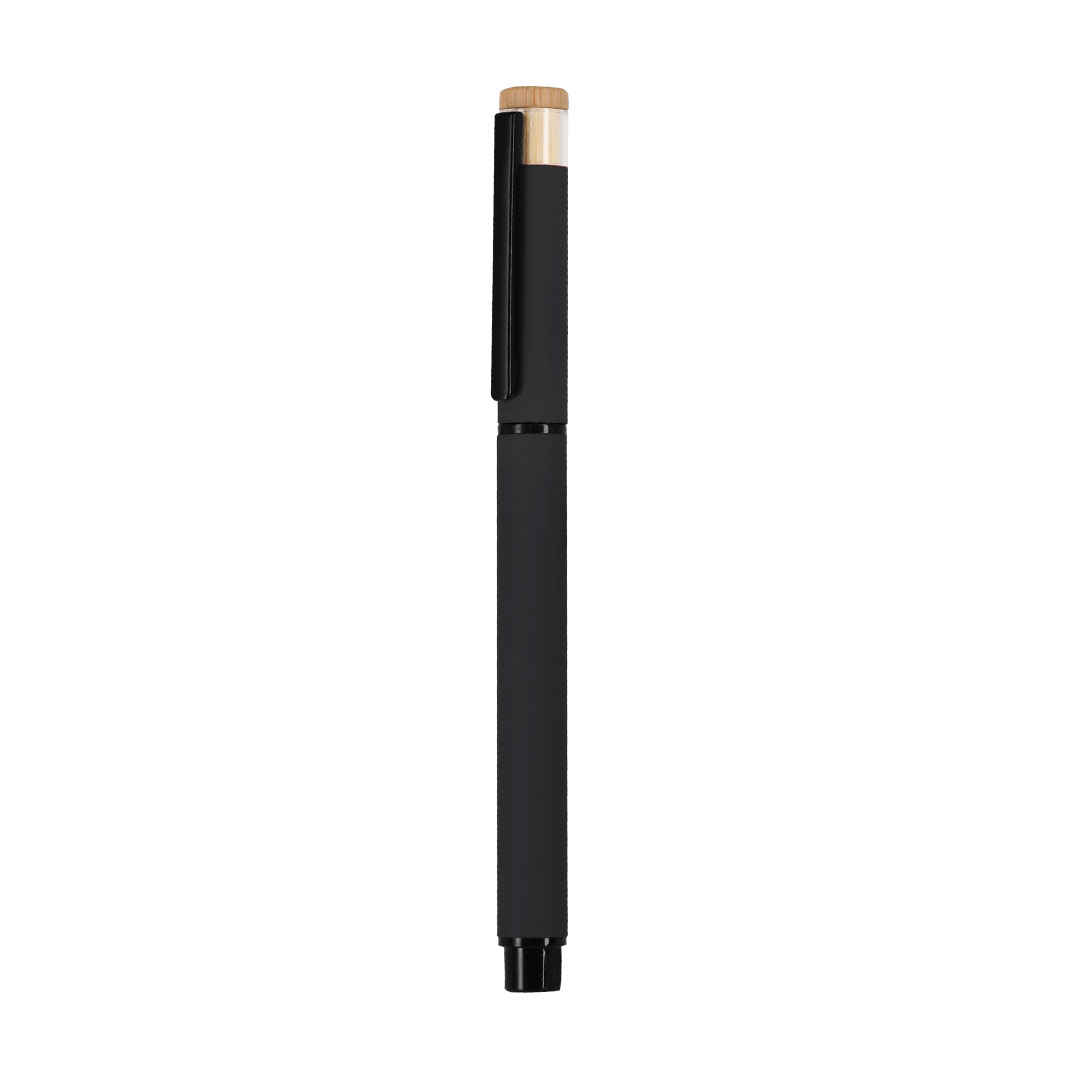 Elegante roller fabricado en bambú y Aluminio Reciclado. Con cuerpo en acabado gomoso. Clip y empuñadura en negro. Con cartucho jumbo, en tinta azul y con cierre de capucha. Con distintivo logo de Aluminio Reciclado. Carga Jumbo Bambú/ Aluminio Reciclado. Acabado Caucho