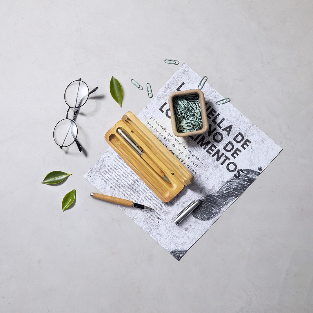 Set de bolígrafo y roller de línea nature. Fabricado en combinación de bambú con metal, para así fomentar la utilización de materias primas naturales y reducir las emisiones contaminantes. Bolígrafo de mecanismo giratorio en tinta azul. Roller con capucha, tinta gel en azul y carga jumbo. Presentado en estuche individual de bambú. Bolígrafo y Roller. Carga Jumbo Bambú/ Metal