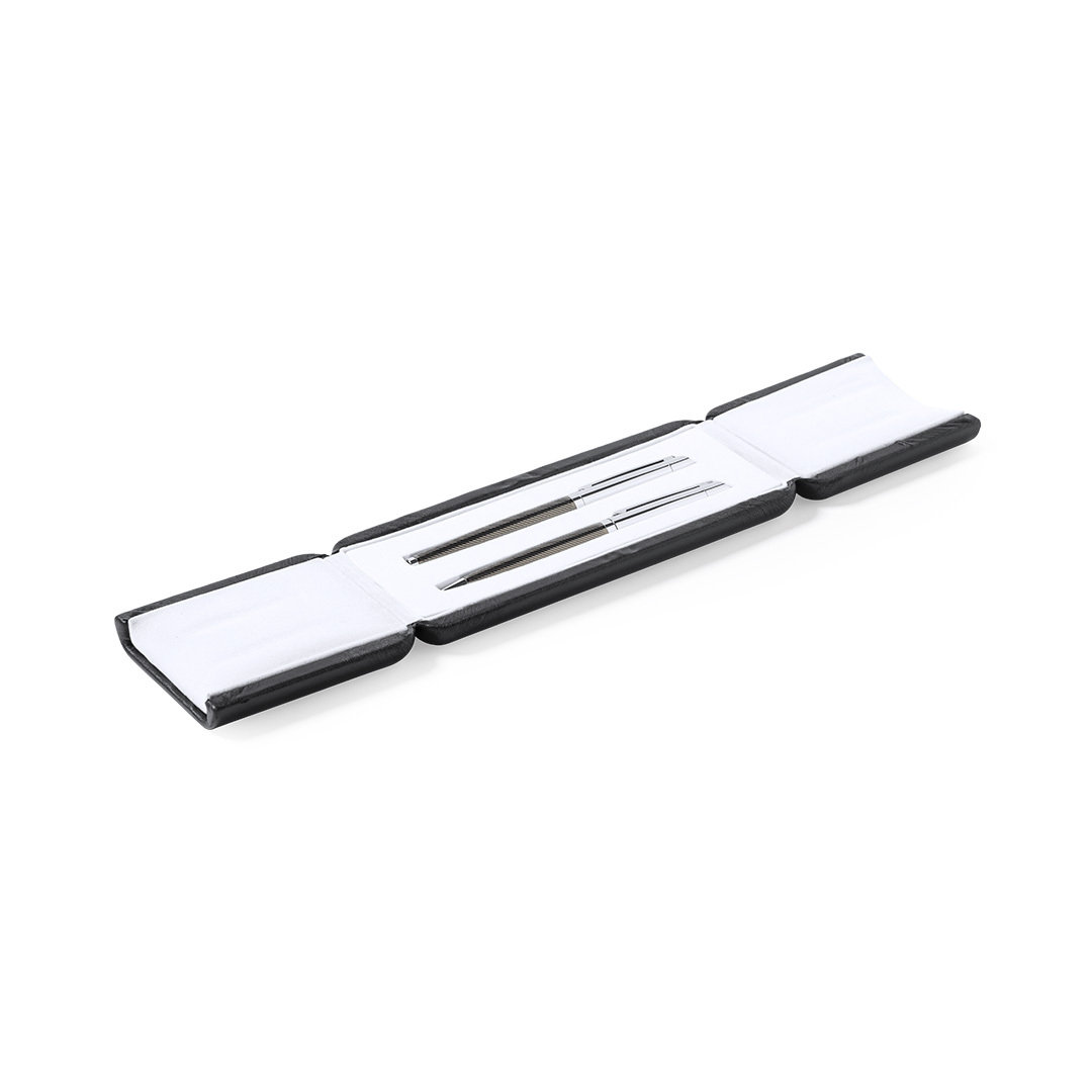 Set premium de bolígrafo y roller. Fabricado en elegante combinación de metal en tonos negros y cromados. Bolígrafo de mecanismo giratorio en tinta azul y con cartucho jumbo. Roller con capucha y tinta gel en azul, carga jumbo. Presentado en estuche individual de polipiel con interior en contraste de antelina en blanco. Bolígrafo y Roller. Carga Jumbo Metal