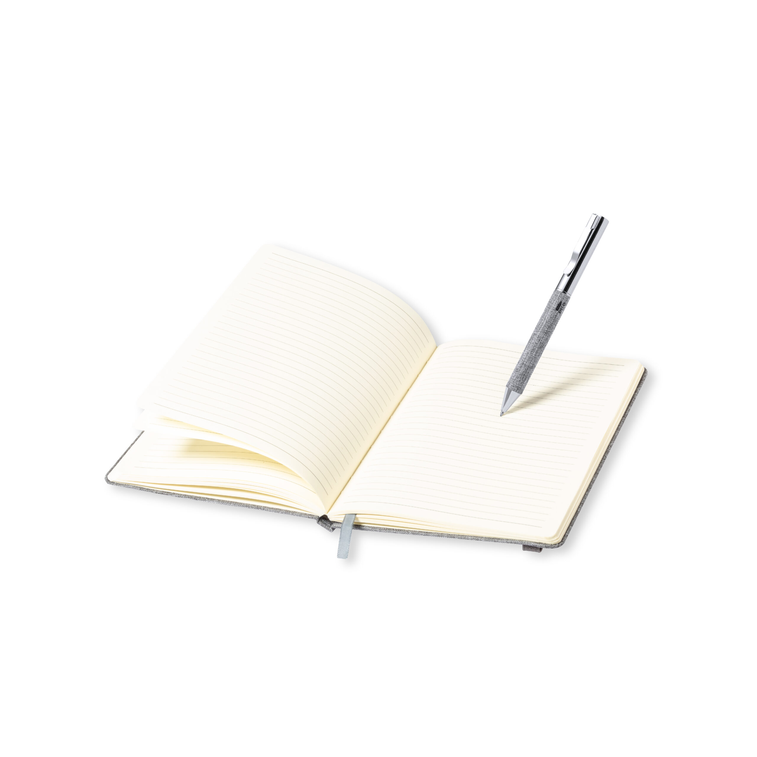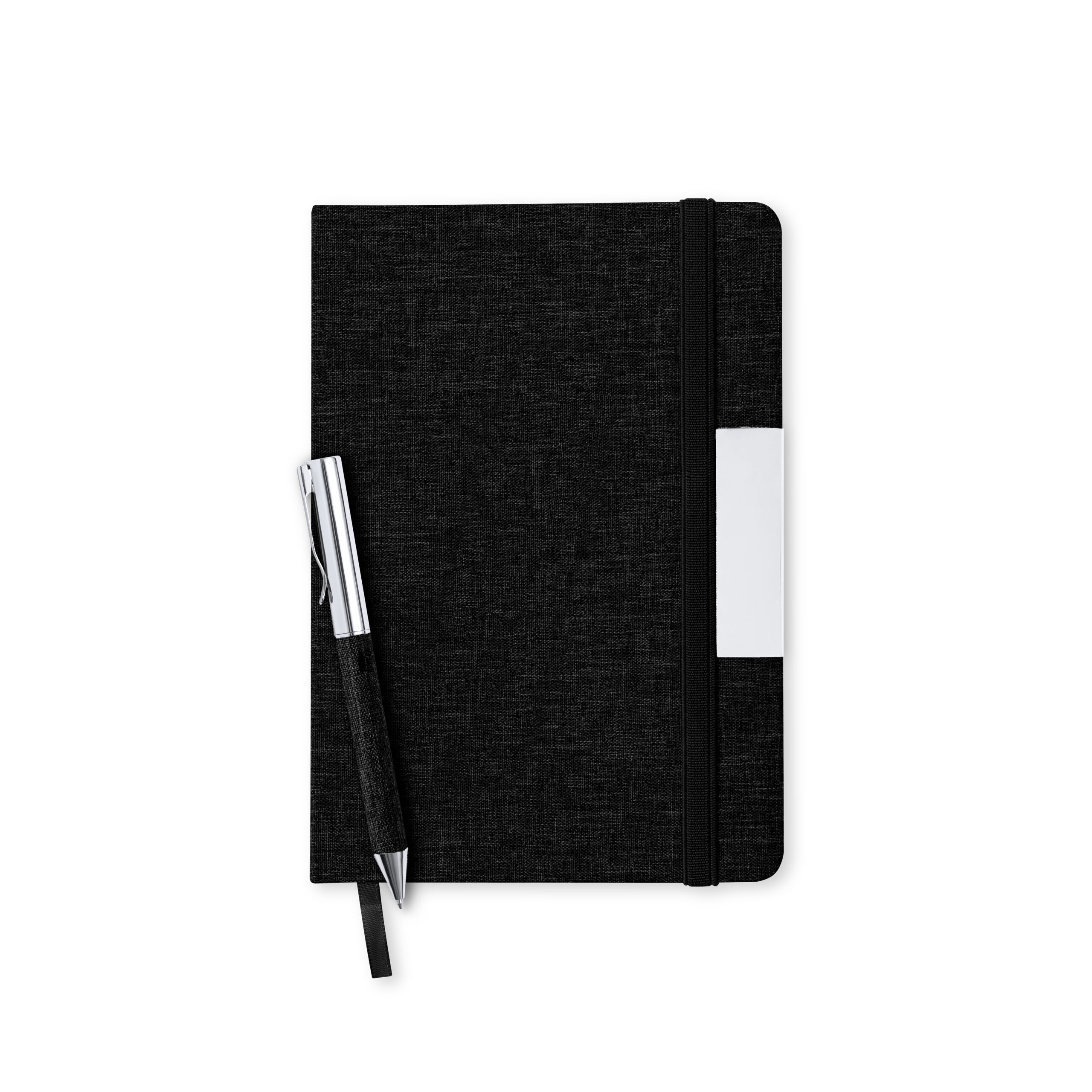 Set de bloc de notas y bolígrafo en RPET, elaborado a partir de plástico reciclado para así fomentar la reutilización de residuos plásticos y ayudar a la sostenibilidad del planeta. Incluye: Bloc de notas de tapas rígidas, con detalle metálico en la portada, marcapáginas de tela y elástico de sujeción a juego. 100 hojas interiores con disposición a una raya y distintivo RPET.Bolígrafo fabricado en metal cromado y con cuerpo recubierto en poliéster RPET. Elegante clip metálico y accesorios a juego, de mecanismo giratorio y en tinta azul. Con distintivo RPET en cuerpo.Set presentado en elegante estuche de diseño en color negro, con compartimento independiente para bloc de notas y bolígrafo. Bloc Portada Rígida. 100 Hojas. Bolígrafo Incluido Poliéster 300D RPET/ Metal