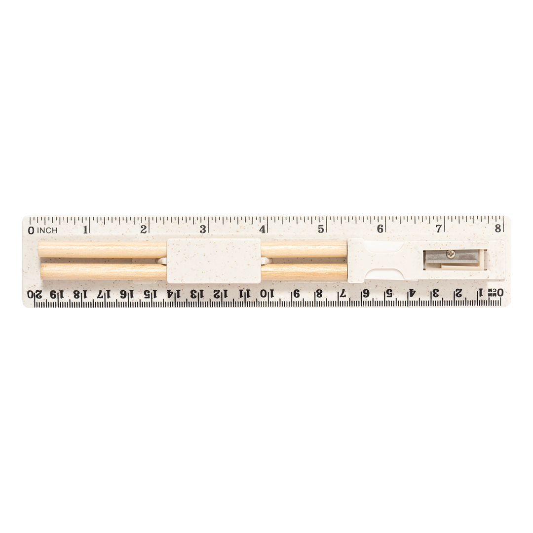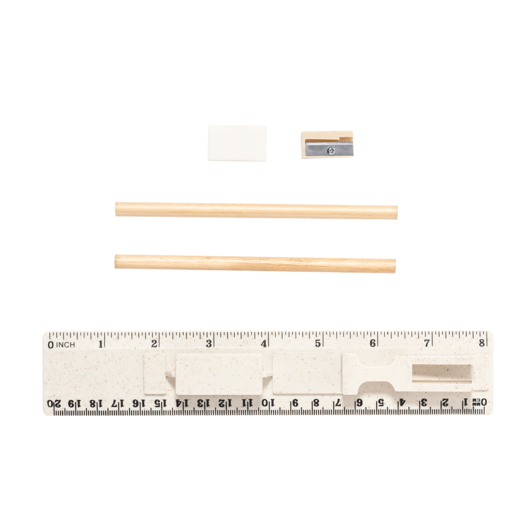 Set de 5 piezas fabricado en caña de trigo. Incluye 2 lápices de madera con mina negra y cuerpo cilíndrico blanco; goma y sacapuntas. Presentado en estuche/regla de 20 cm/8 pulgadas, con compartimentos para los distintos elementos del set. Presentado individualmente en una bolsa de papel blanca. La caña de trigo fomenta la utilización de materias primas naturales, reduciendo así las emisiones contaminantes. 5 Piezas Caña de Trigo/ ABS
