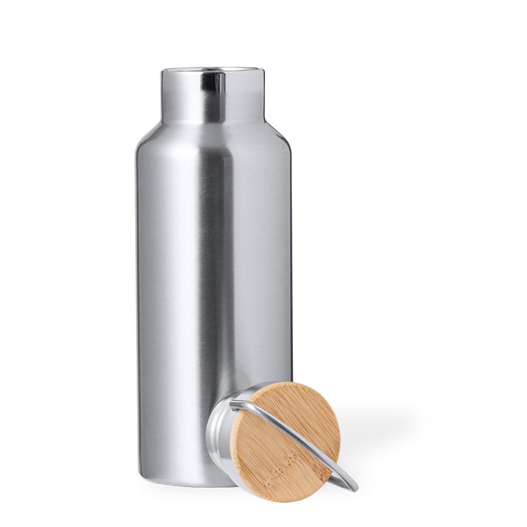 Práctico set de bidón y vaso térmico en acero inox. Incluye, bidón térmico de 500 ml de capacidad fabricado en acero inox, tapón de seguridad a rosca con base de bambú e incluye asa de transporte. Además, contiene 1 vaso de 300 ml de capacidad en acero inox y tapadera bambú con cierre de presión. Presentado en una caja de diseño kraft.   Bidon Térmico 500 ml. Vaso Térmico 300 ml   Acero Inox/ Bambú