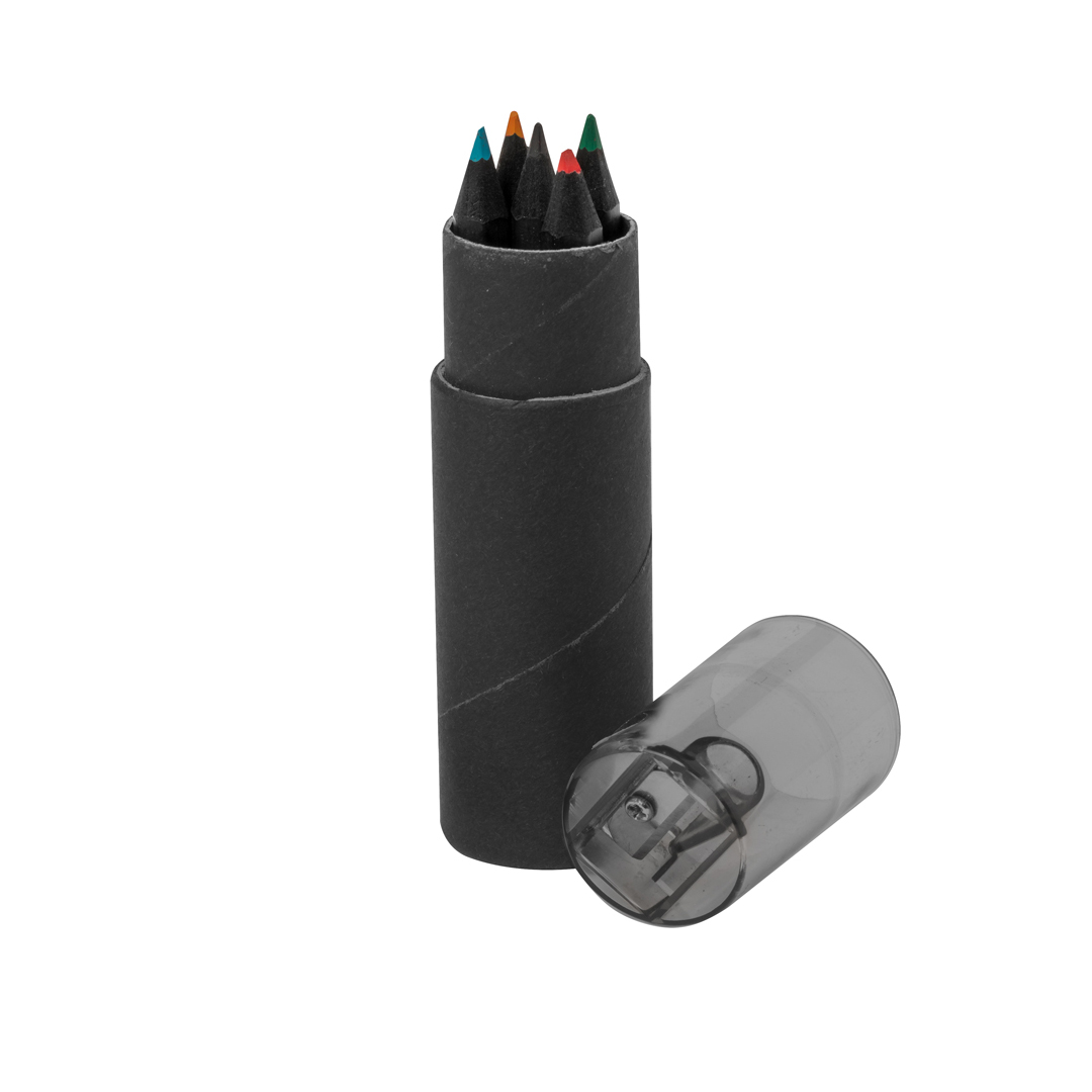 Set de 6 lápices de madera acabada en color negro, con cuerpo hexagonal y minas en varios colores. Presentados en estuche cilíndrico de cartón reciclado negro, con capucha transparente a juego y sacapuntas integrado.   7 Piezas   Cartón Reciclado