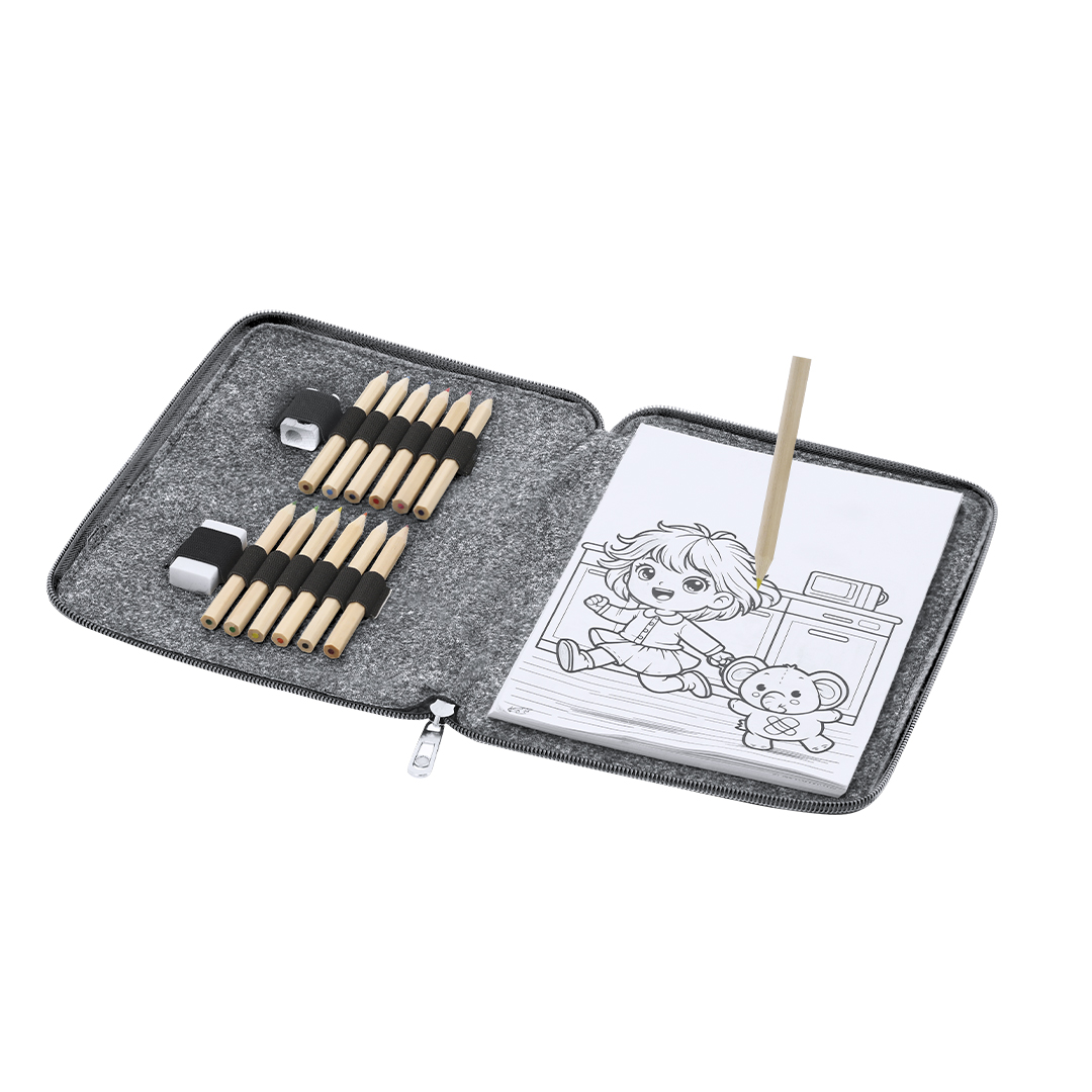 Set de lápices de colores en estuche fabricado en Fieltro RPET. Incluye 11 lápices en diferentes colores de forma hexagonal, 1 goma de borrar, 1 sacapuntas de madera y 60 hojas con divertidos diseños en blanco y negro para colorear. Presentado en un práctico estuche con cierre de cremallera en color bitono e interior con bandas elásticas para organizar los accesorios. Con distintivo de RPET.El fieltro RPET es fruto de la combinación del proceso de reciclaje de materiales plásticos junto con la técnica milenaria de fabricación del fieltro, dando como resultado un material de eco-tendencia que, además de ser de origen reciclado, también se convierte en reciclable. 15 Piezas. Bloc 60 Hojas Fieltro RPET